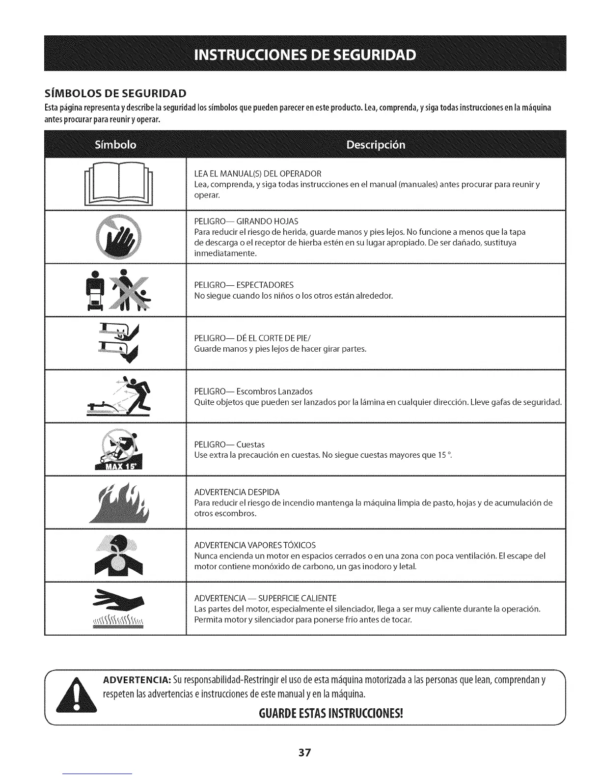 Esta p_gina representa y describela seguridad lossimbolosque pueden parecer en este producto. Lea, comprenda, y sigatodas instruccionesen la m_quina