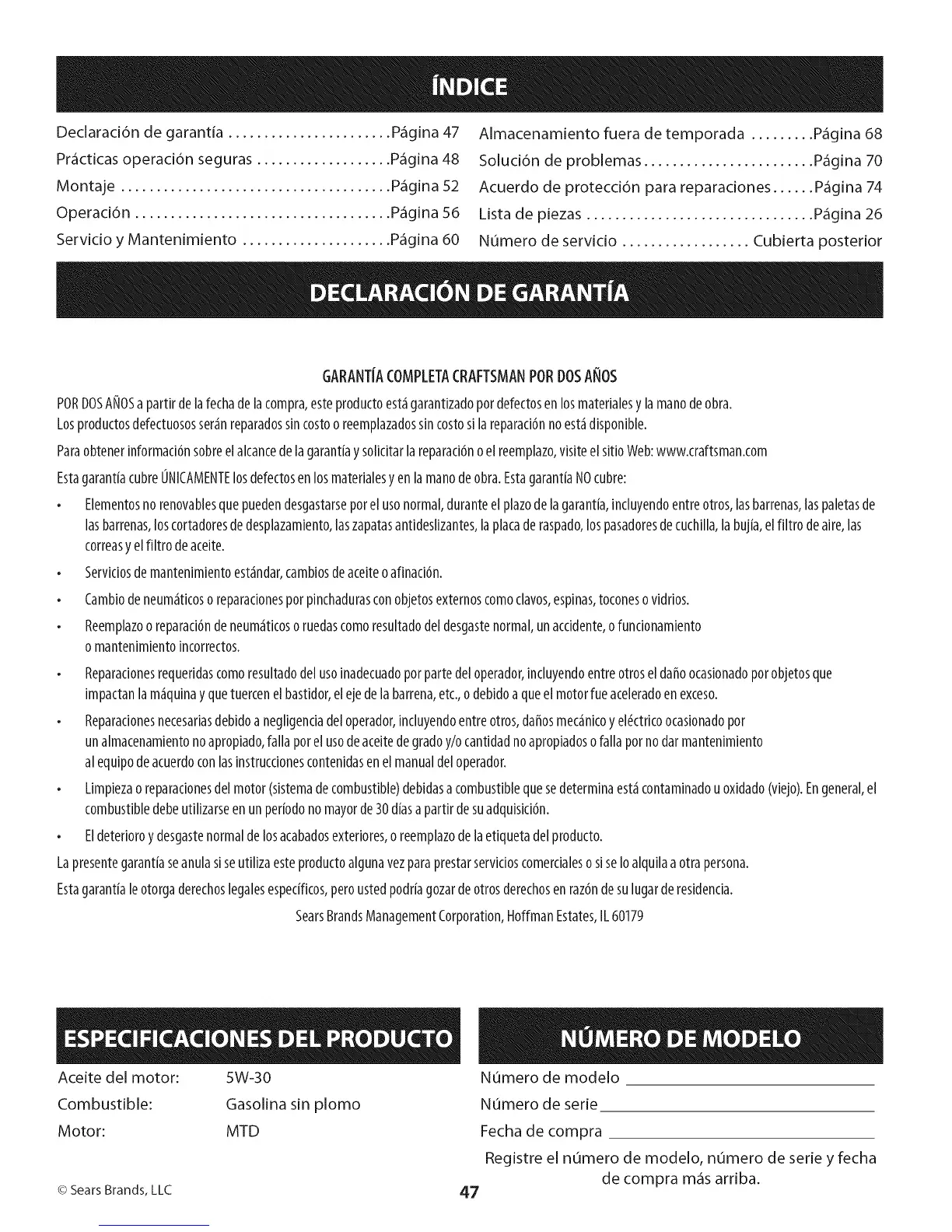 Declaraci6n de garantia ....................... P_gina 47