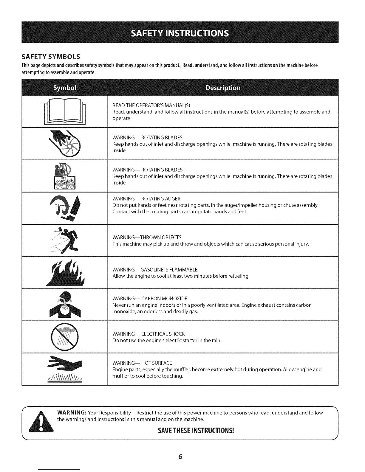 WARNING: Your Responsibility--Restrict the use of this power machine to persons who read, understand and follow