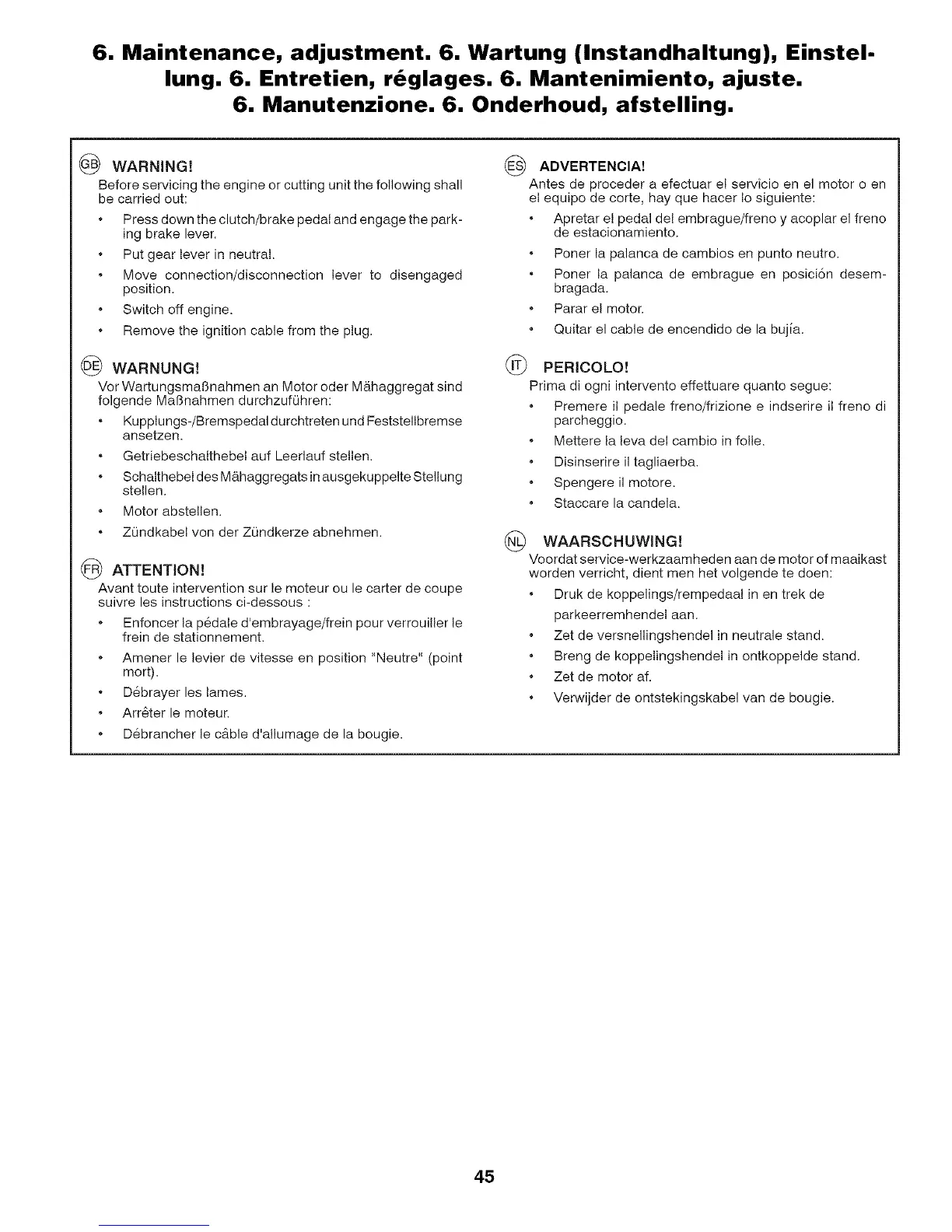 lung. 6. Entretien, r(_glages. 6. Mantenimiento, ajuste.