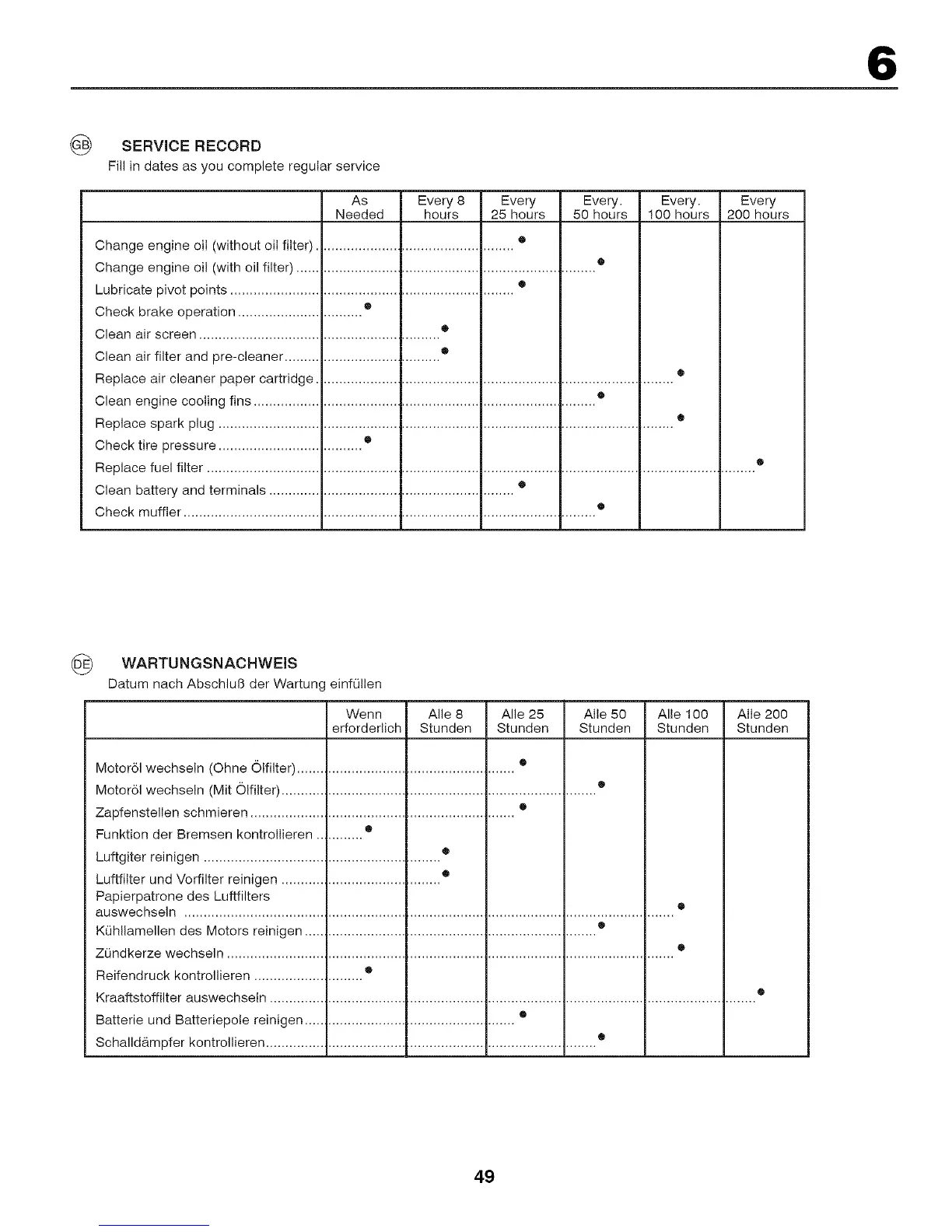 Fill in dates as you complete regular service