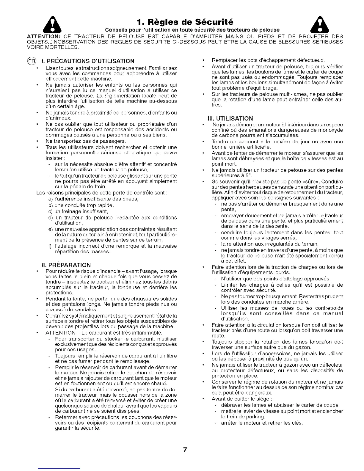 ATTENTION: CE TRACTEUR DE PELOUSE EST CAPABLE D'AMPUTER MAINS OU PIEDS ET DE PROJETER DES