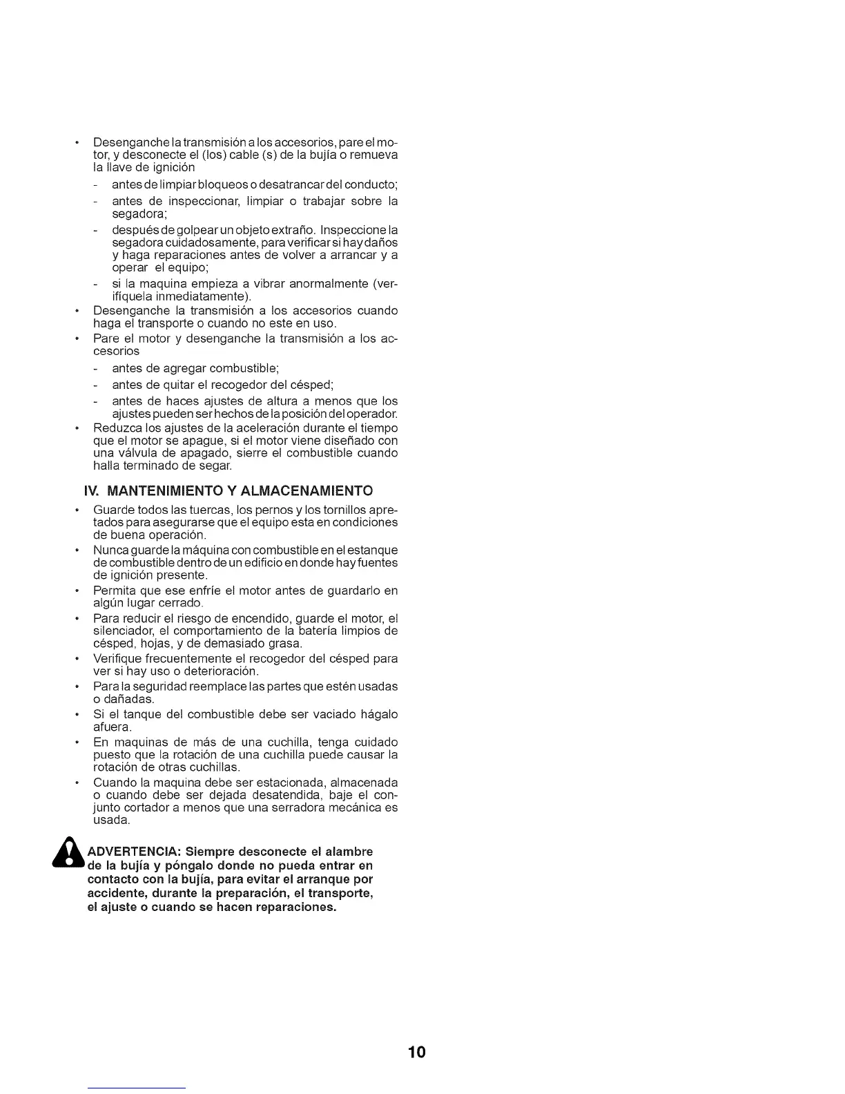 • Desenganche la transmisi6n a los accesorios cuando
