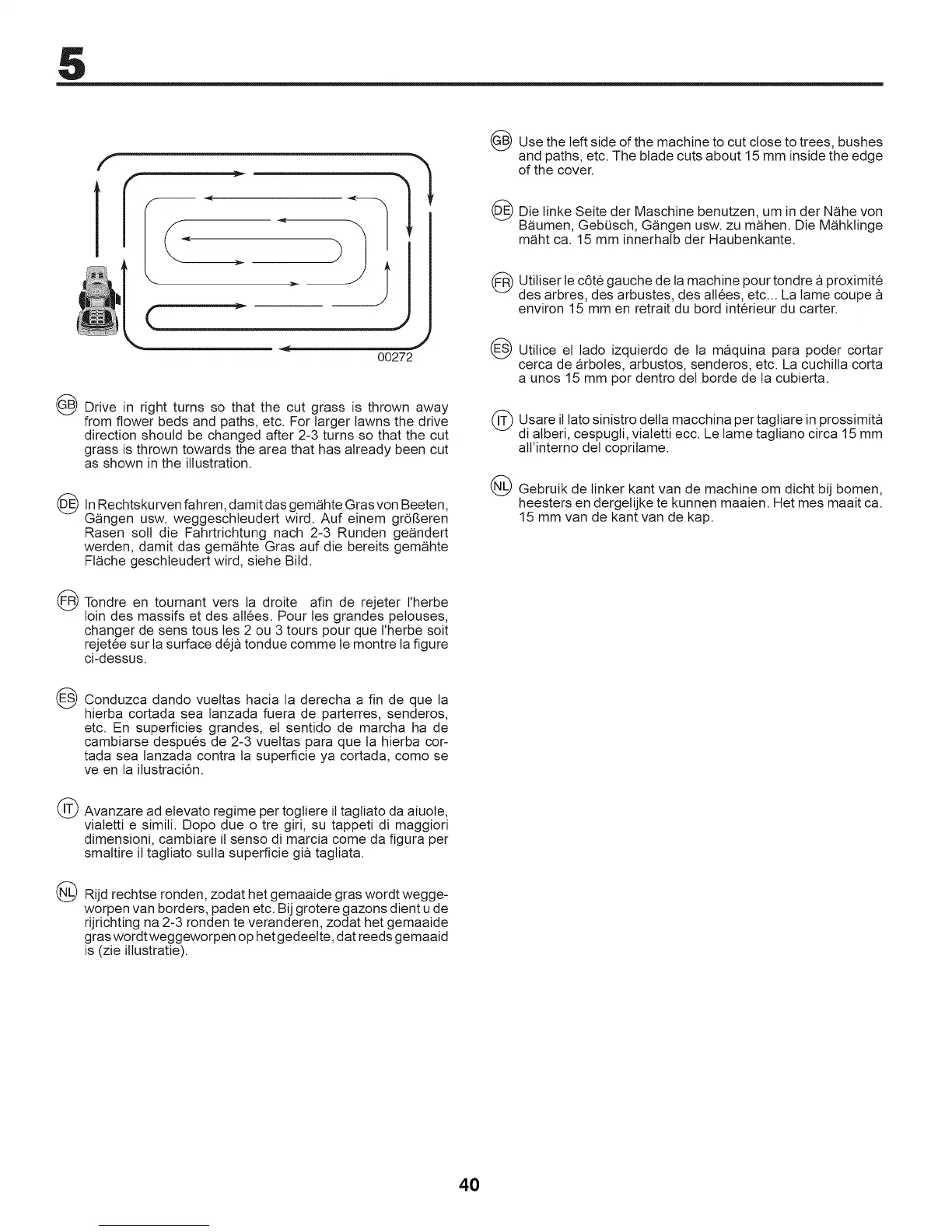 Drive in right turns so that the cut grass is thrown away