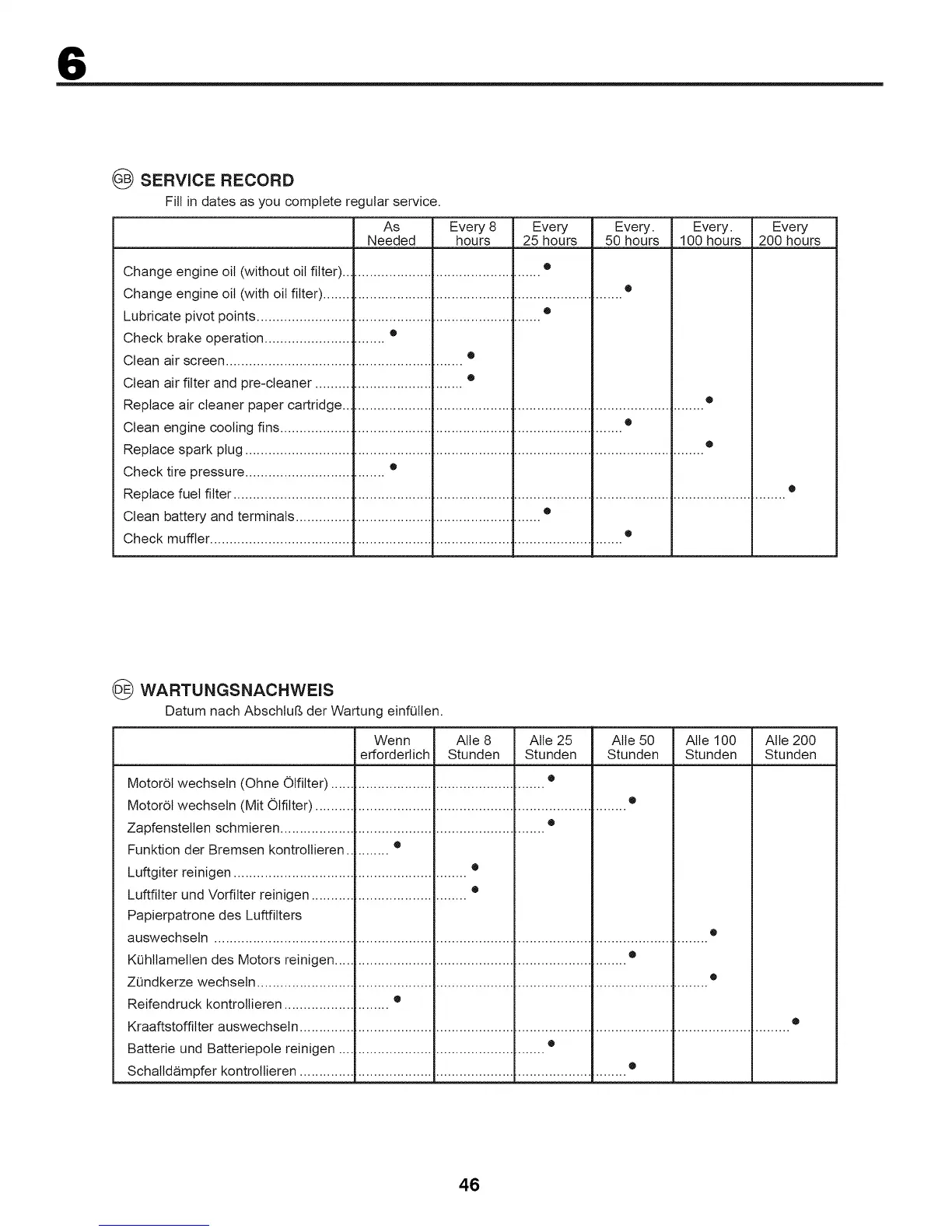 Fill in dates as you complete regular service.