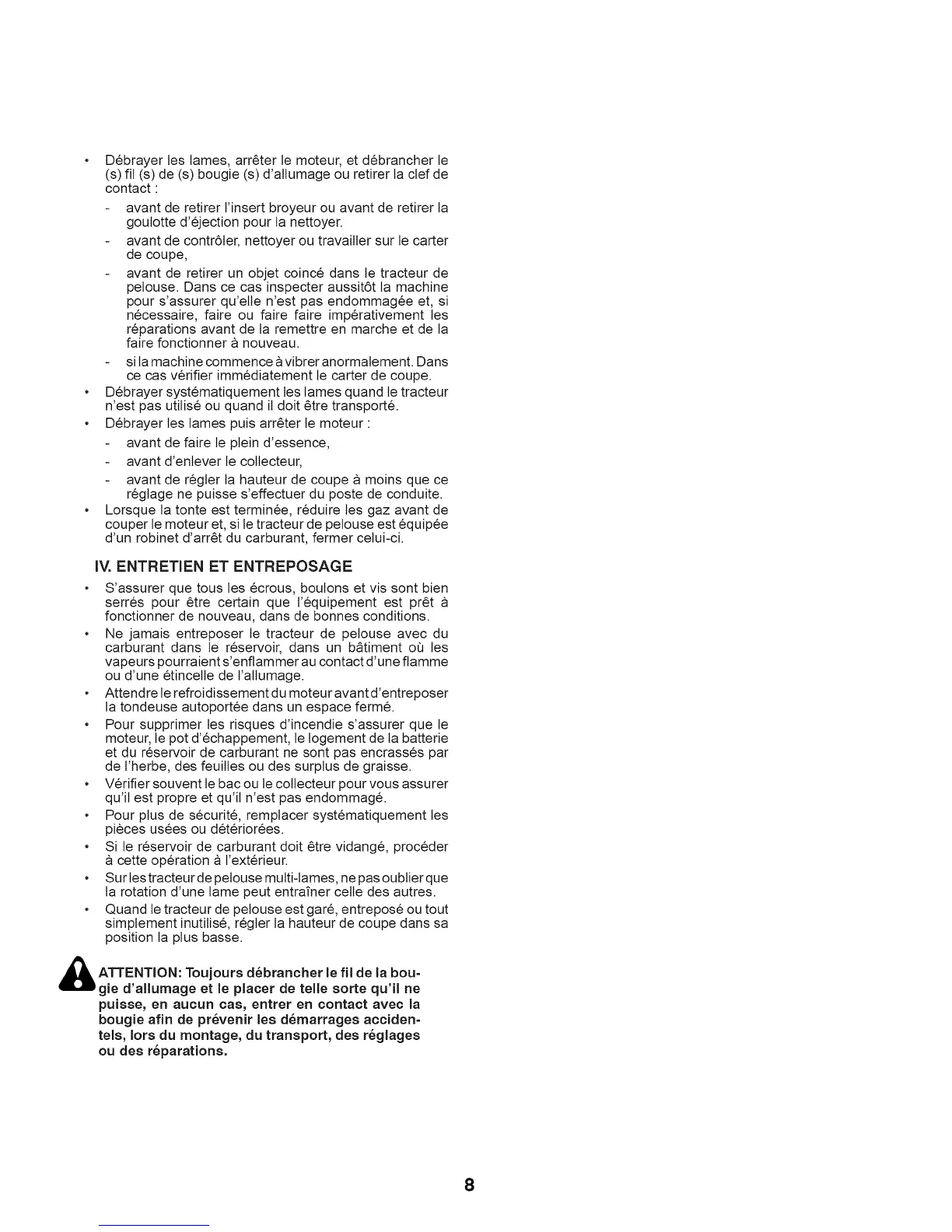 • Quand te tracteur de pelouse est gare, entrepose ou tout