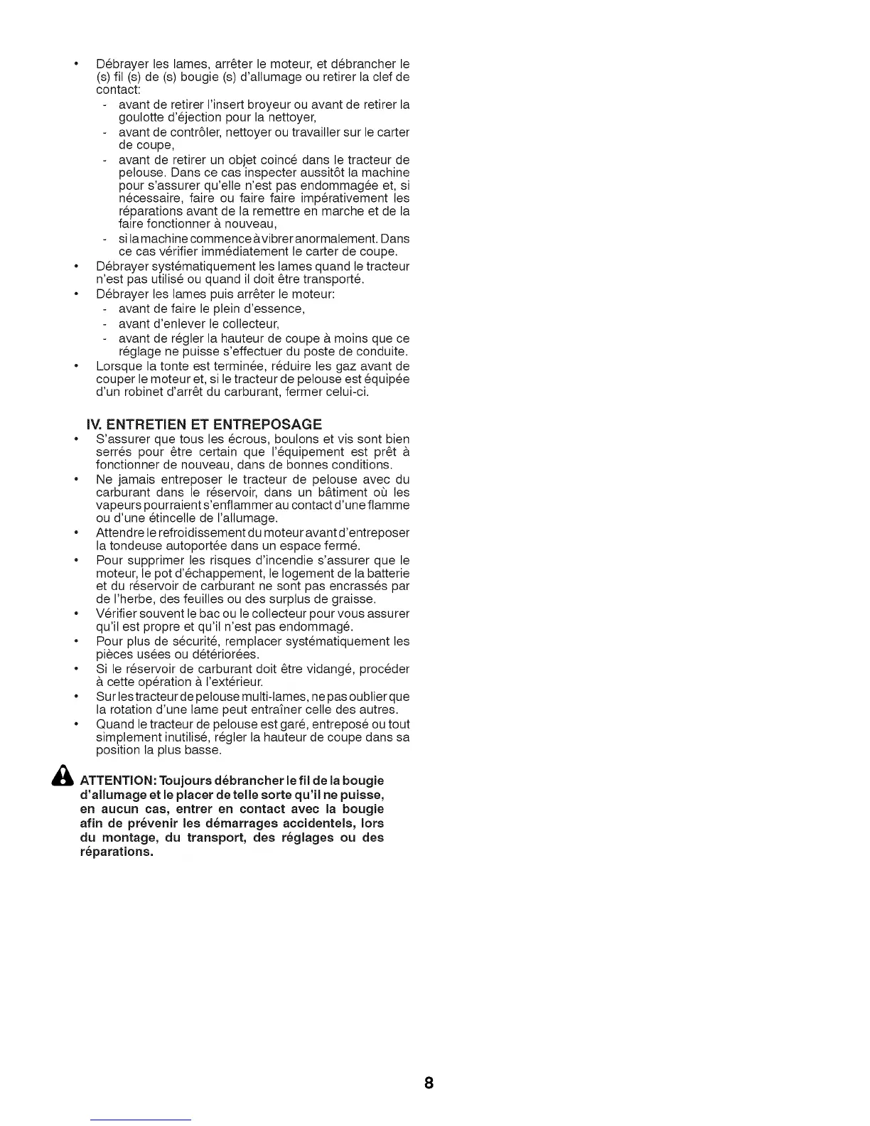 • Debrayer les lames, arr6ter le moteur, et debrancher le