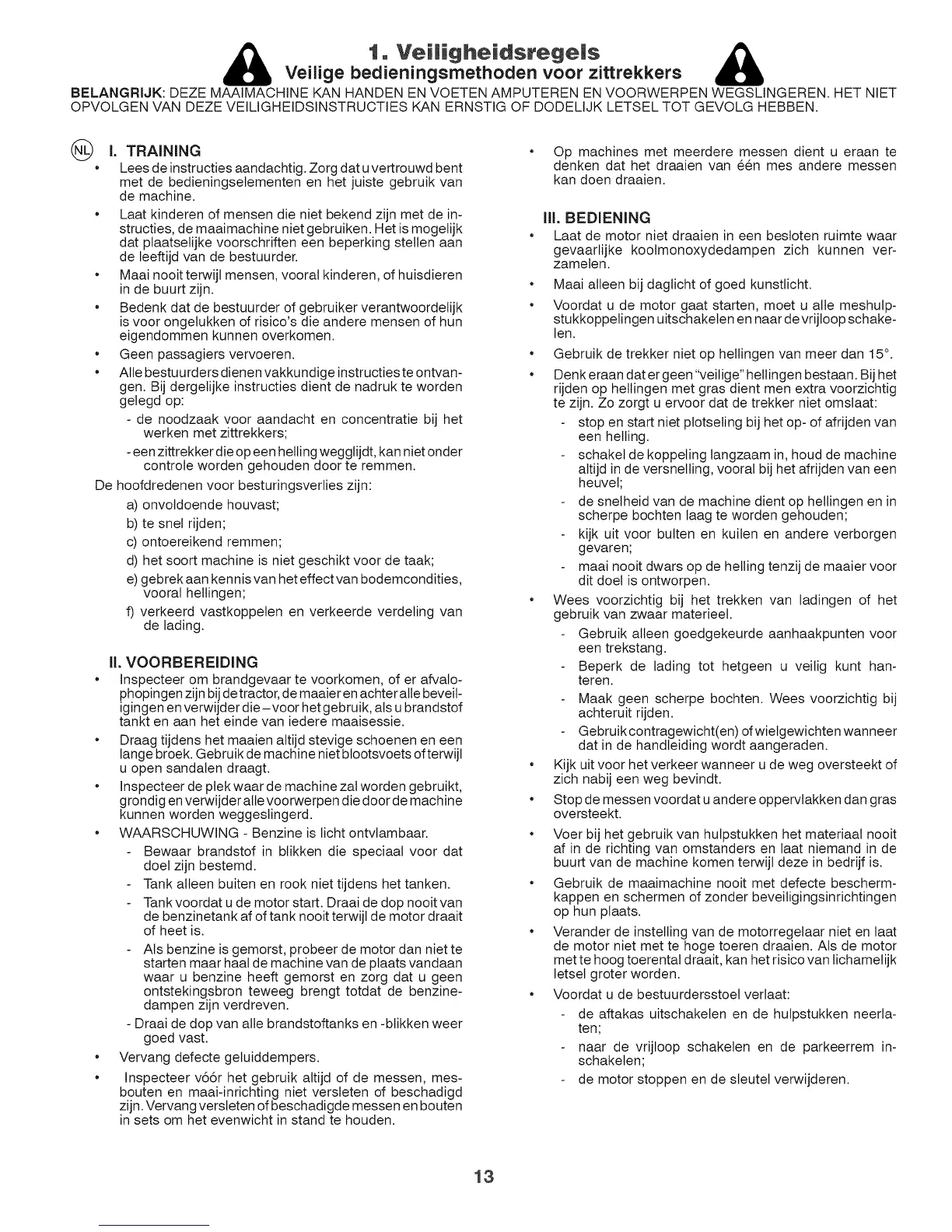 BELANGRIJK: DEZE MAAIMACHINE KAN HANDEN EN VOETEN AMPUTEREN EN VOORWERPEN WEGSLINGEREN. HET NIET