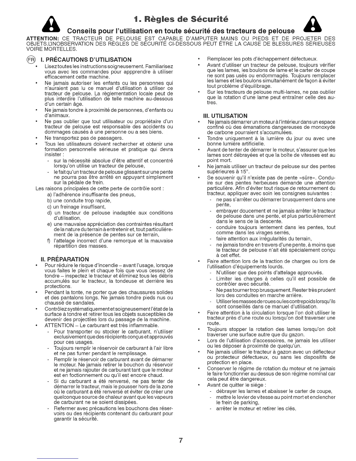 ATTENTION: CE TRACTEUR DE PELOUSE EST CAPABLE D'AMPUTER MAINS OU PIEDS ET DE PROJETER DES