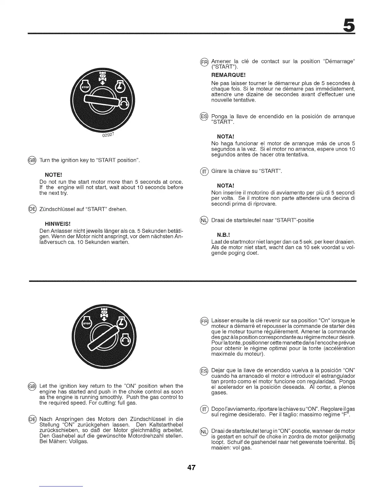 Do not run the start motor more than 5 seconds at once.