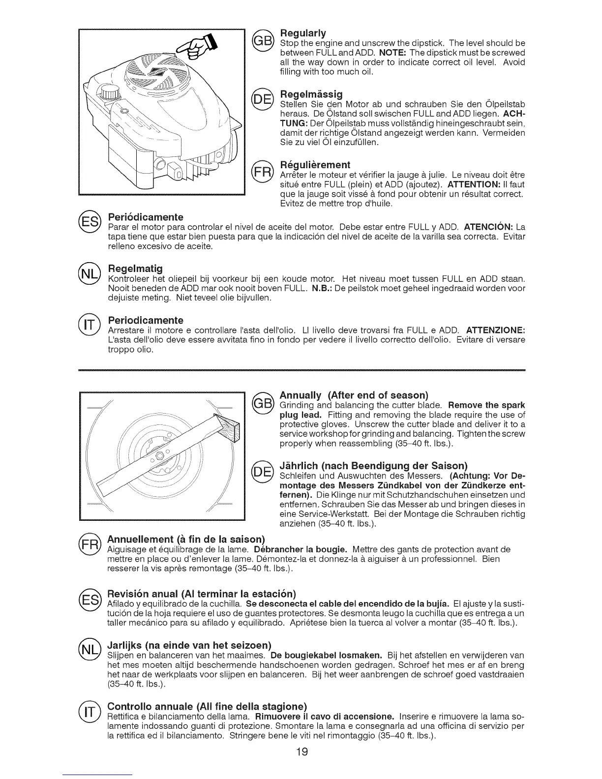 Parar el motor para controlar et nivel de aceite del motor. Debe estar entre FULL y ADD. ATENCION: La