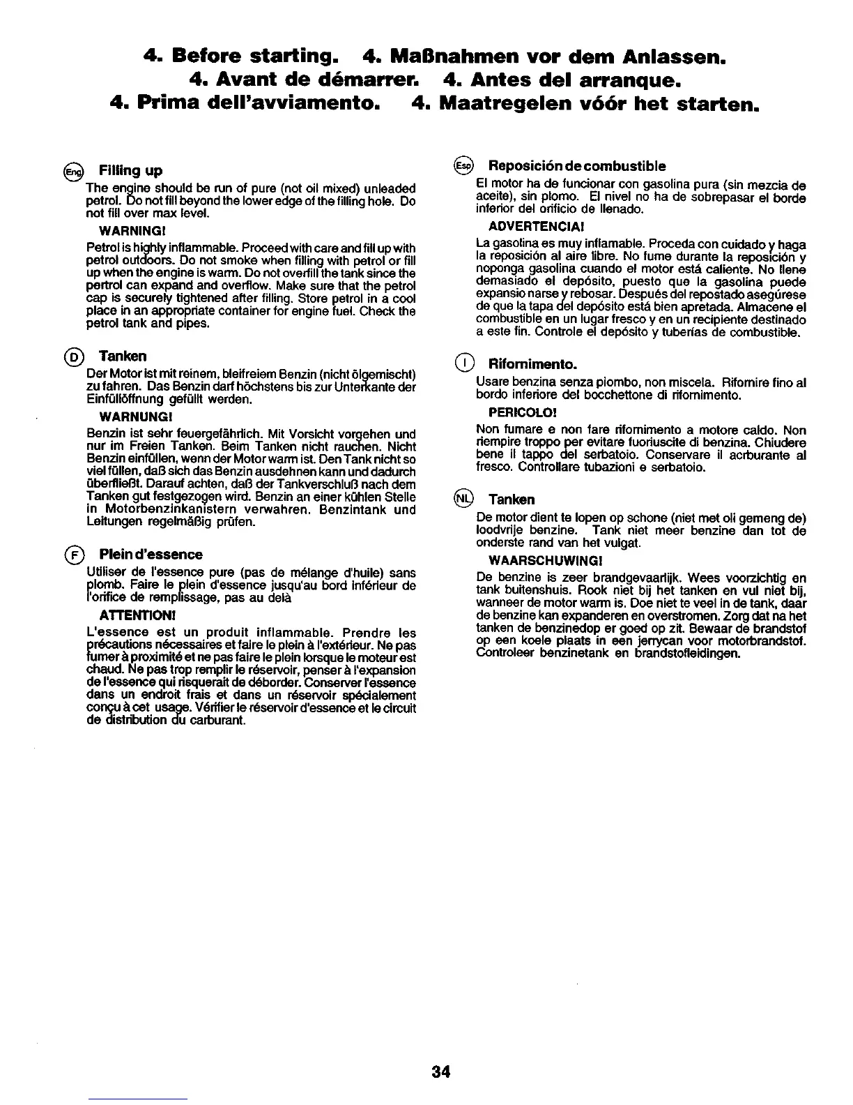 4. Before starting. 4. MaSnahmen vor dem Anlassen.