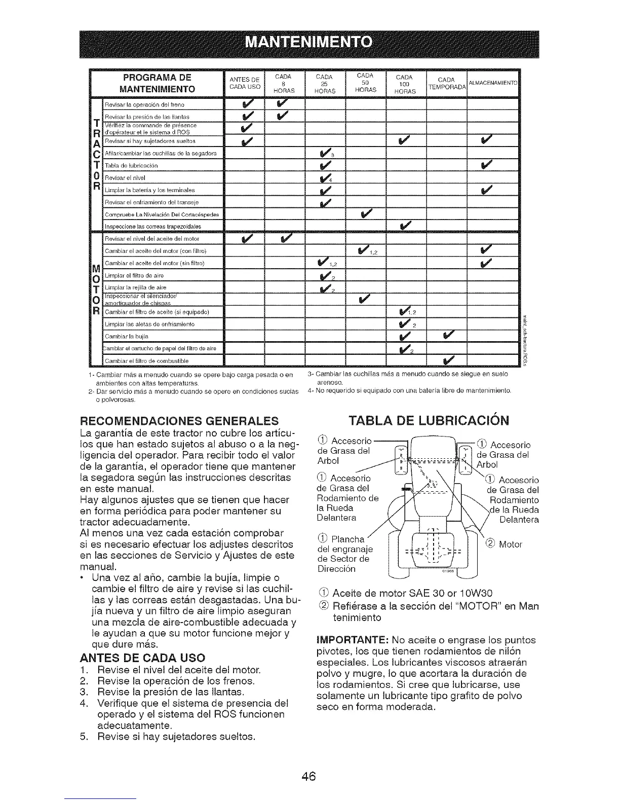2- Dar servicio mAs a menudo cuando se opere en condiciones sucias 4- No requeddo si equipado con una bateria libre de mantenimiento