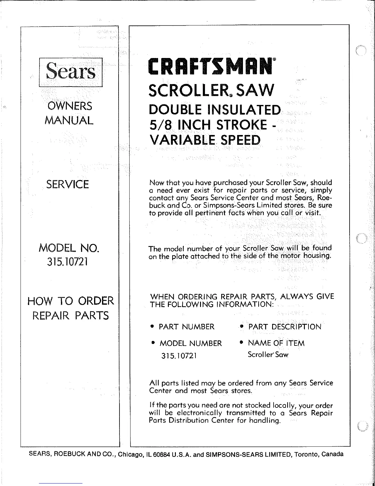 Craftsman 315.10721 - Ordering Repair Parts