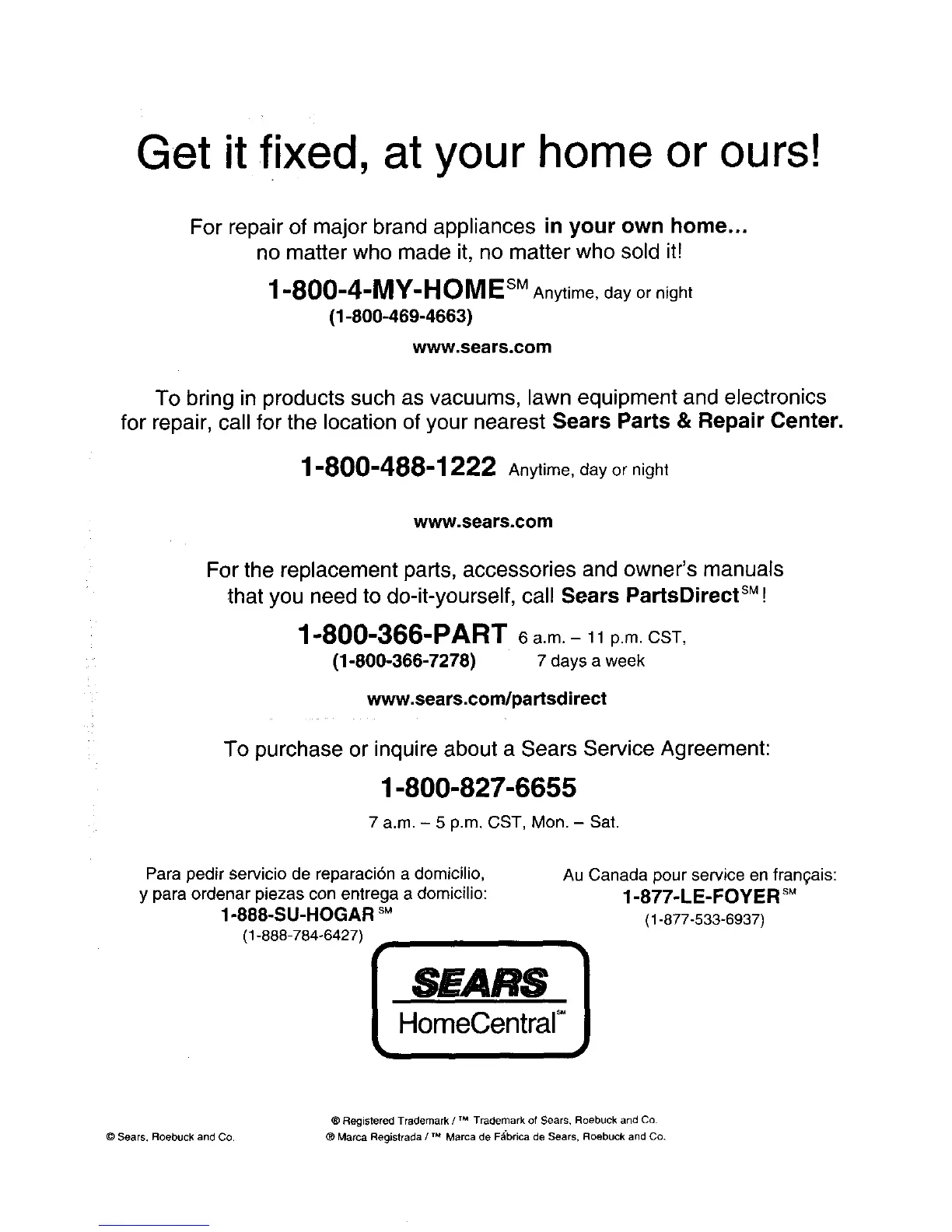 for repair, call for the location of your nearest Sears Parts & Repair Center.