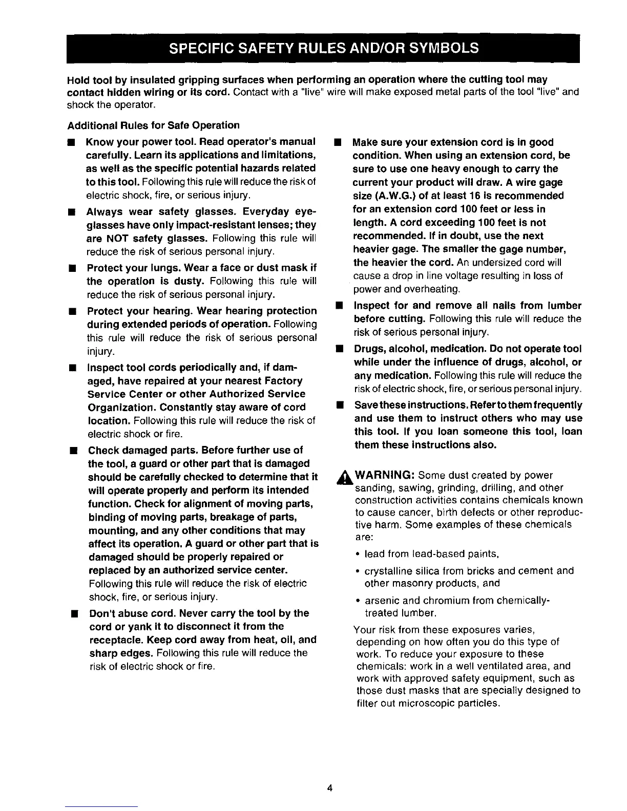 contacthiddenwiringor its cord.Contactwitha "live" wire will make exposed metal parts of the tool "live" and