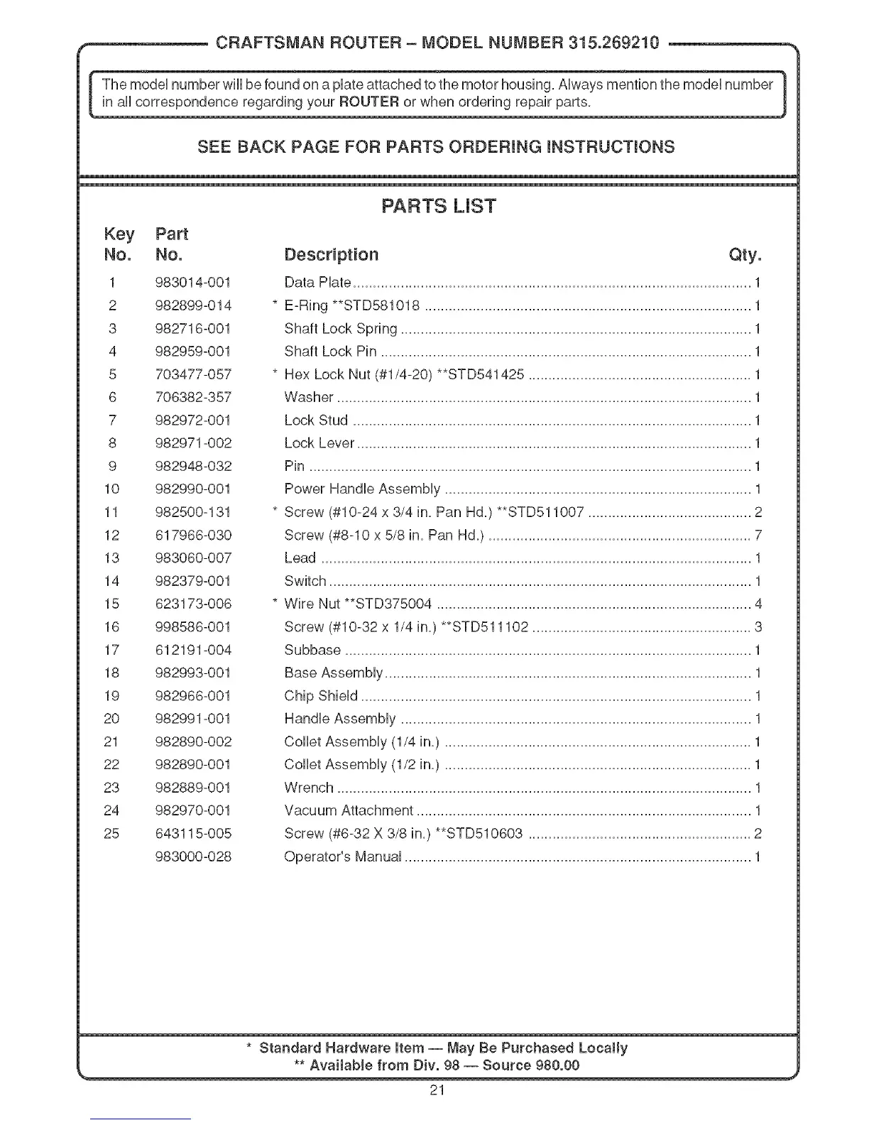 CRAFTSMAN ROUTER - MODEL NUMBER 315.269210