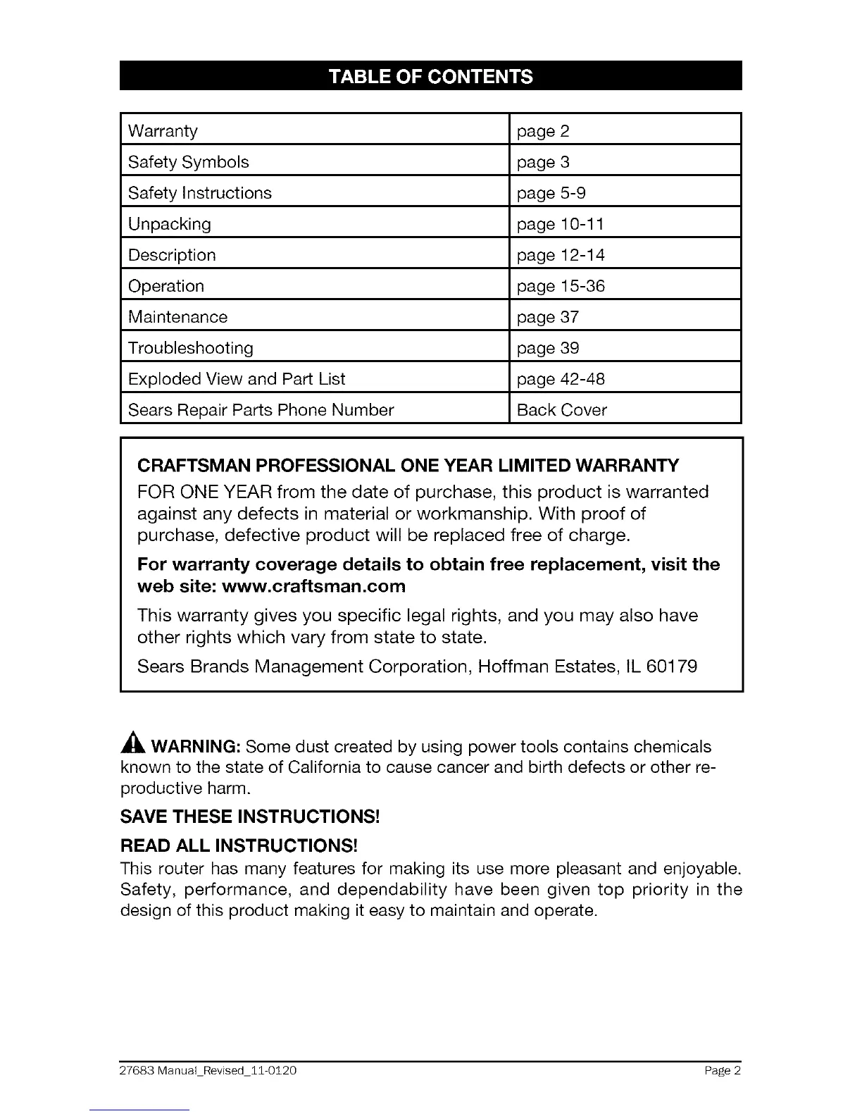 CRAFTSMAN PROFESSIONAL ONE YEAR LIMITED WARRANTY