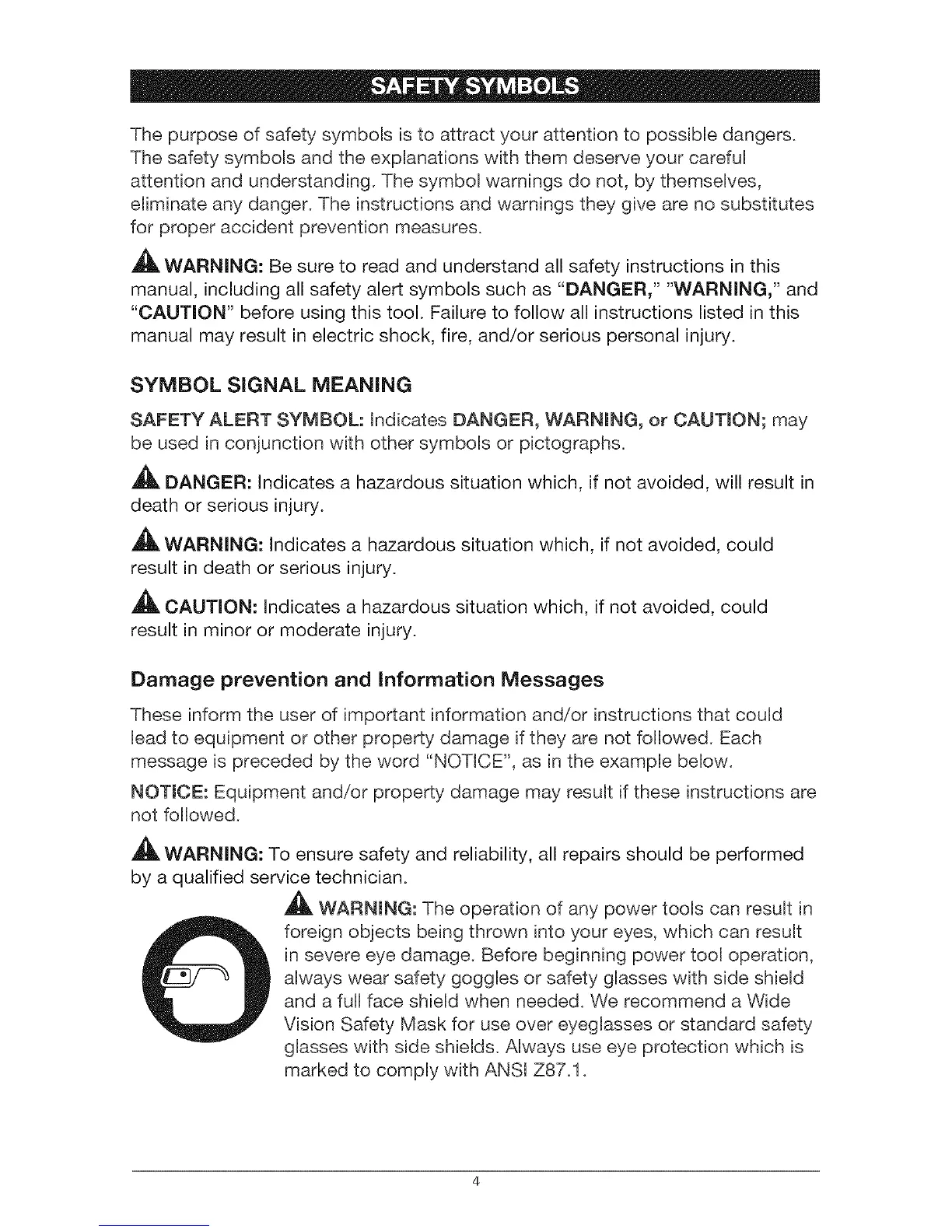 in severe eye damage. Before beginning power tool operation,
