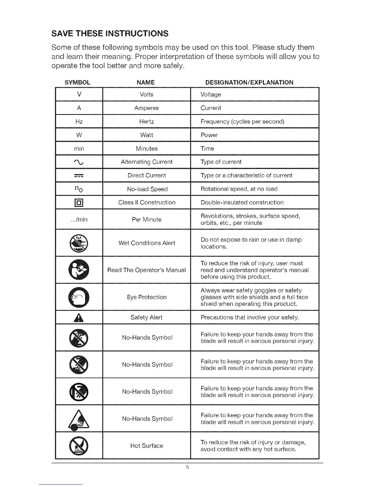 No=Hands Symbol Failure to keep your hands away from theblade will result in serious personal injury.