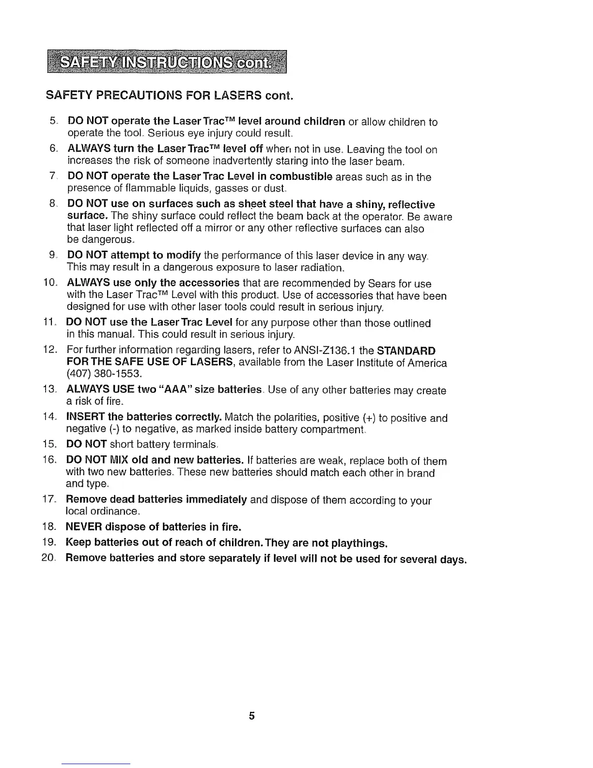 5 DO NOT operate the LaserTrac TM level around children or allow children to