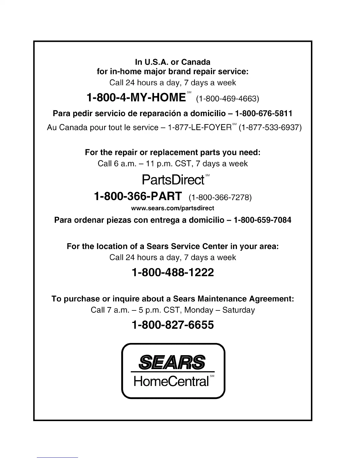 To purchase or inquire about a Sears Maintenance Agreement: