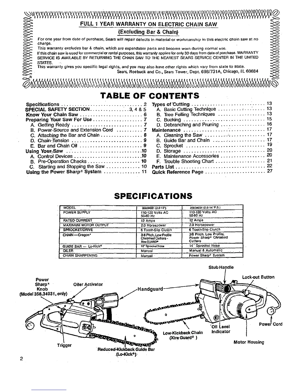 For one year from date of purchase, Sears will repafr defects in material or workmanship in this elecldc chain saw st no ><:_