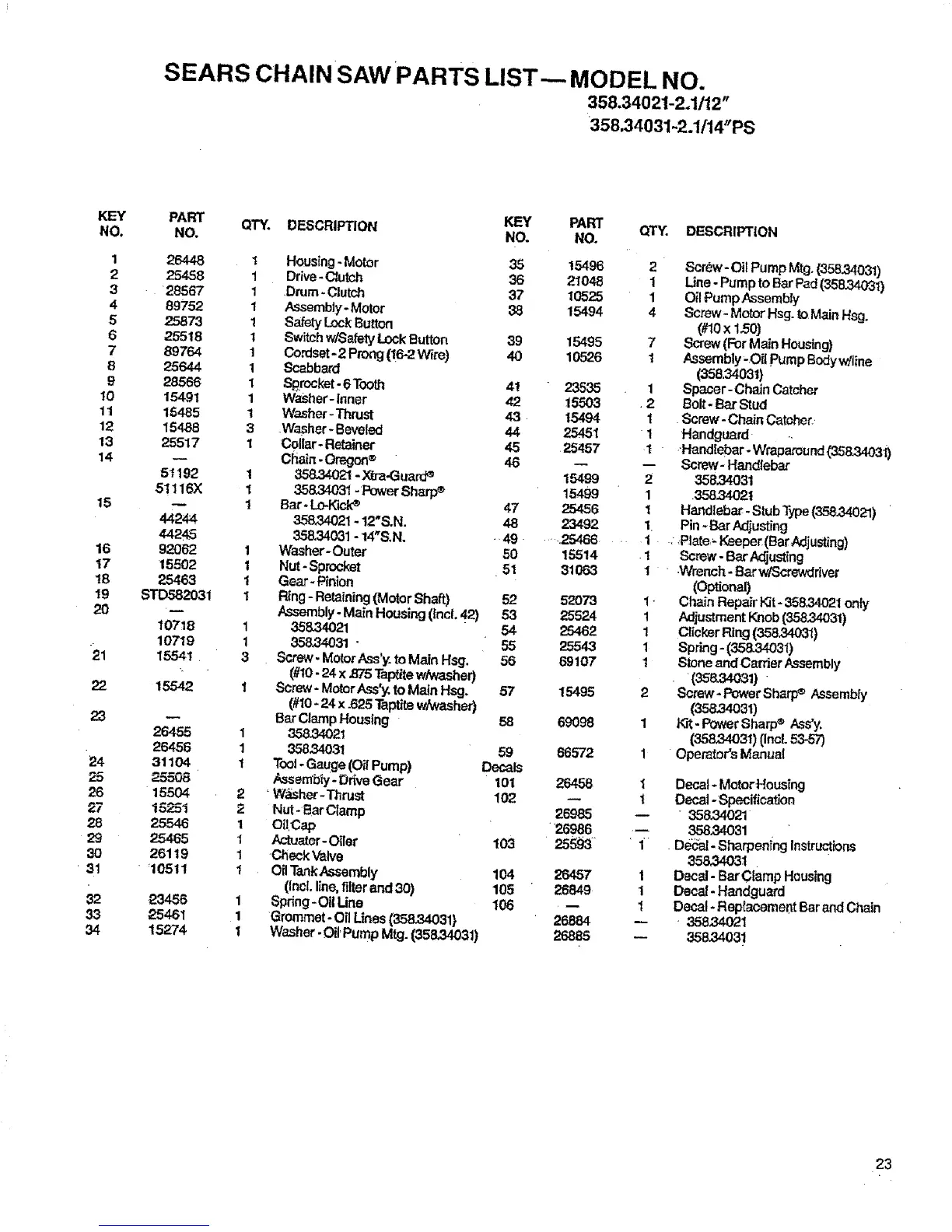 SEARS CHAIN SAW PARTS LIST--- MODEL NO.