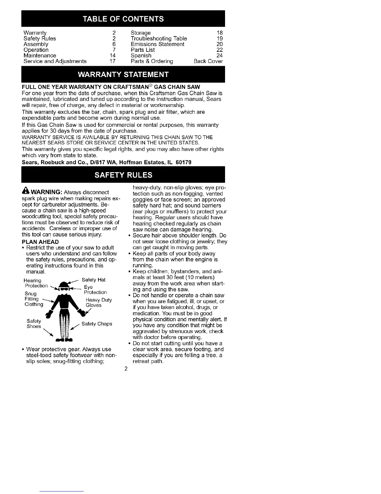 FULL ONE YEAR WARRANTY ON CRAFTSMAN ® GAS CHAIN SAW