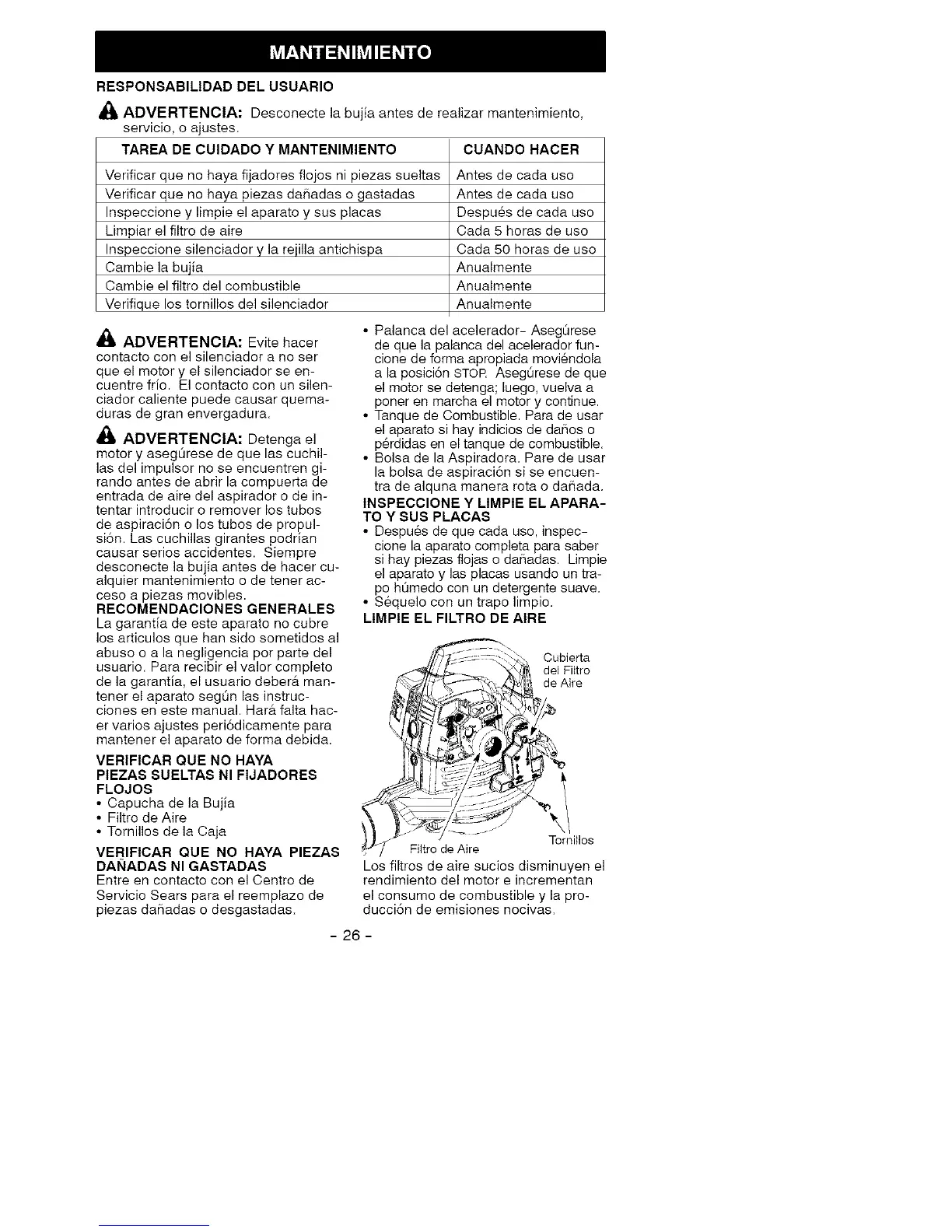 ADVERTENCIA: Desconecte la bujia antes de realizar mantenimiento,