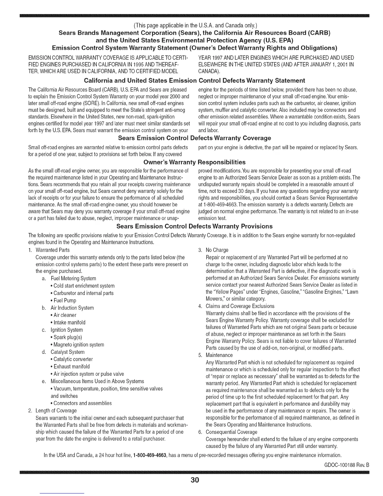 ThefollowingarespecificprovisionsrelativetoyourEmissionControlDefectsWarrantyCoverage.ItisinadditiontotheSearsenginewarrantyfornon-regulated