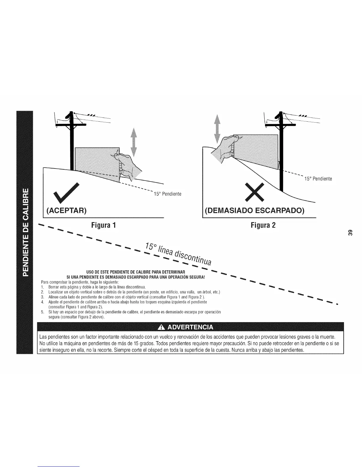 No utilice la ma.quinaen pendientes de masde 15grados. Todos pendientesrequiere mayorprecauciCn.Si no puede retrocederen la pendiente o si se
