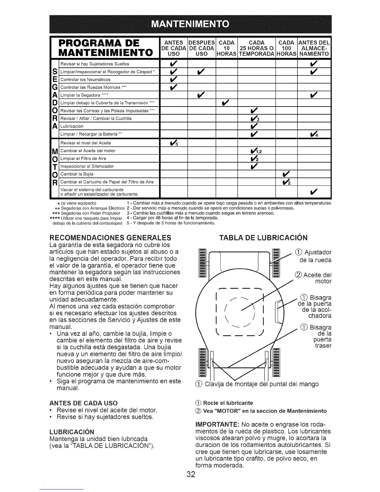 (vea la "TABLA DE LUBRICAClON").