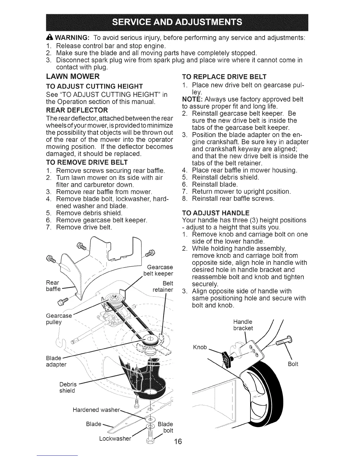 A WARNING: To avoid serious injury, before performing any service and adjustments: