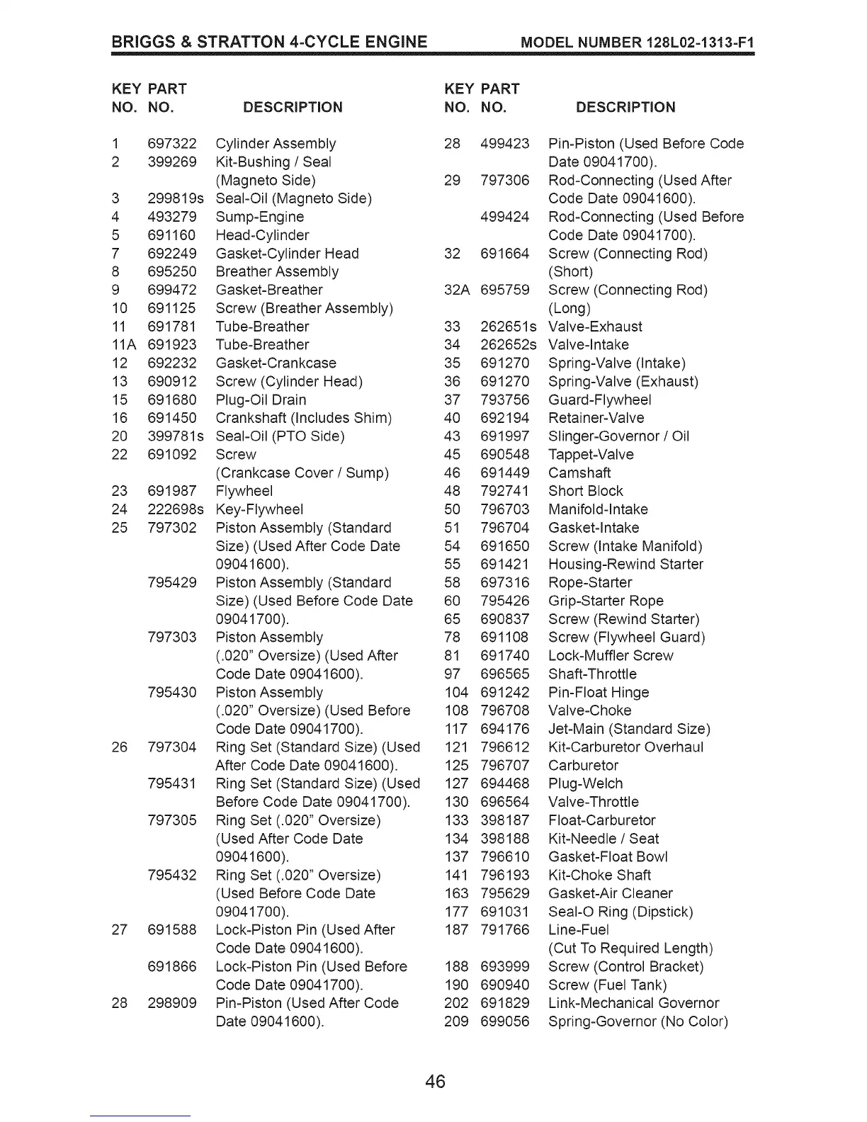 Size) (Used Before Code Date 60 Grip=Starter Rope