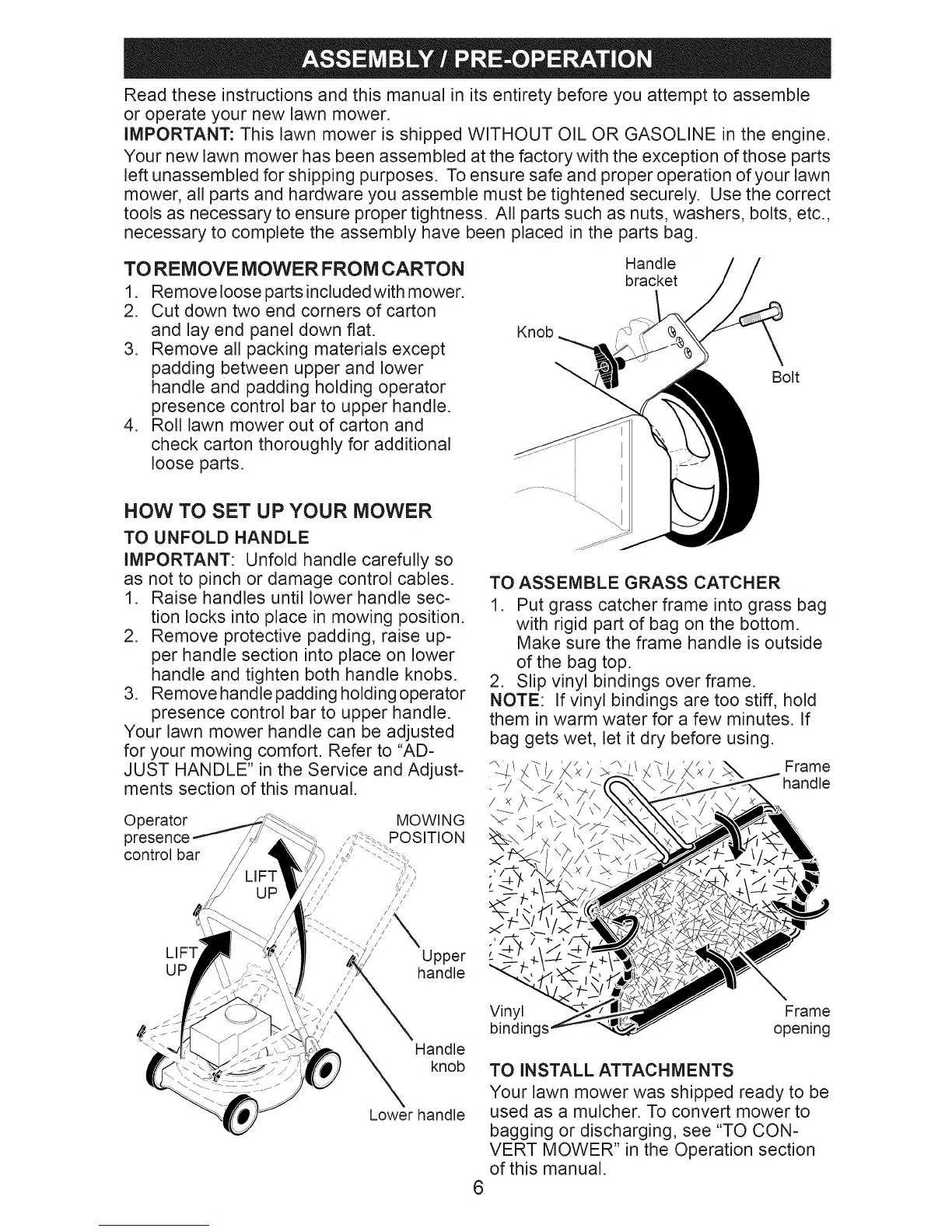 IMPORTANT: This lawn mower is shipped WITHOUT OIL OR GASOLINE in the engine.