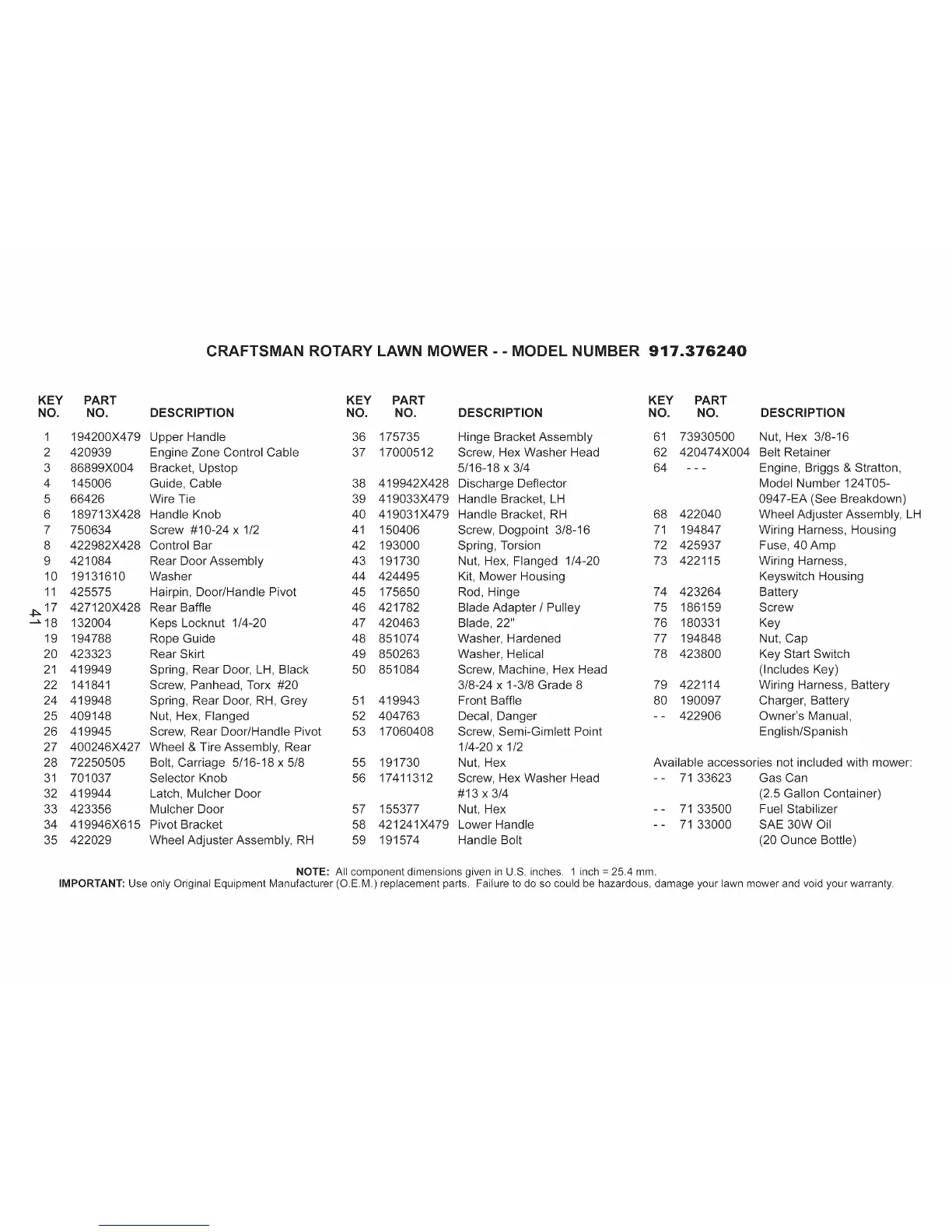 IMPORTANT: Use only Original Equipment Manufacturer (OE.M) replacement parts. Failure to do so could be hazardous, damage your lawn mower and void your warranty.