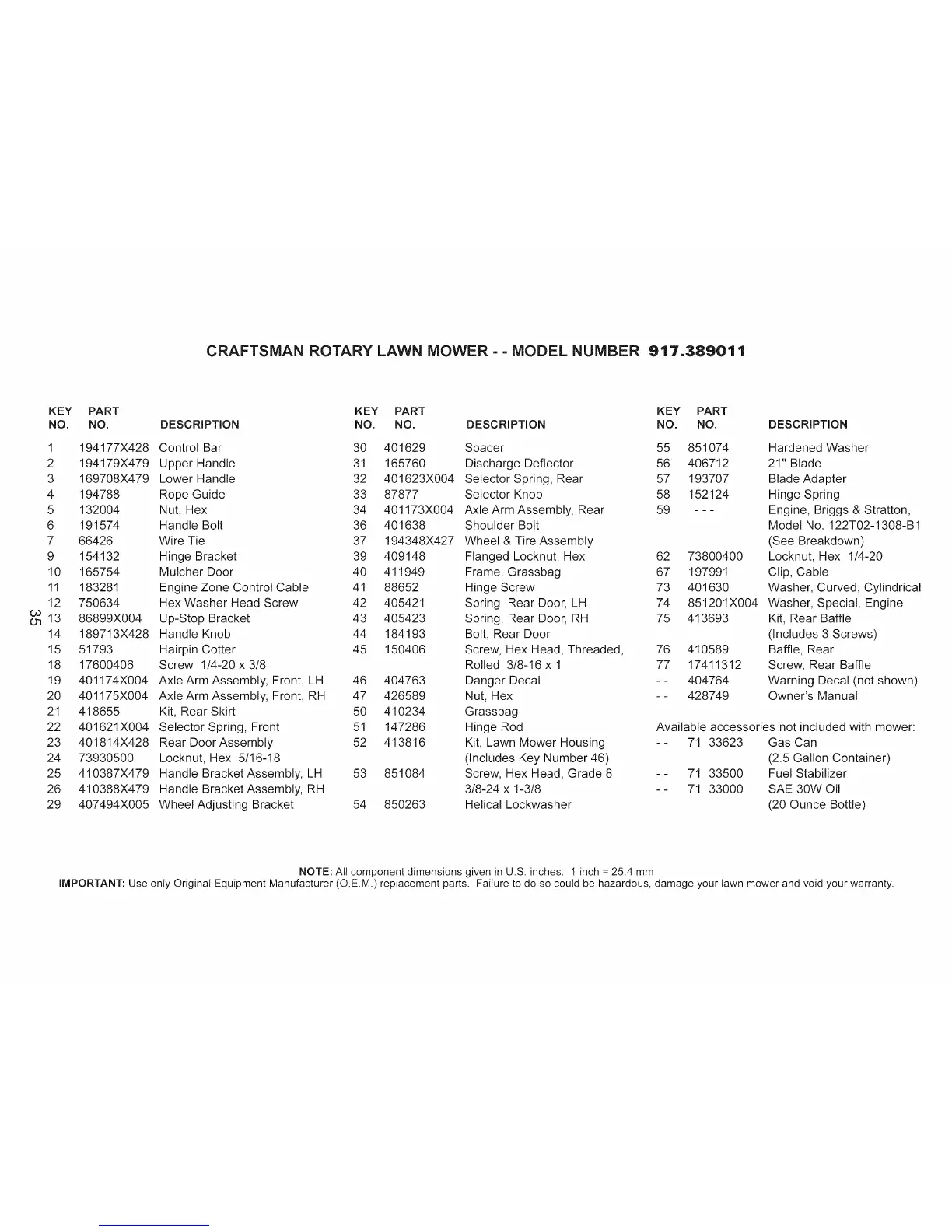 IMPORTANT: Use only Original Equipment Manufacturer (O.E.M.) replacement parts. Failure to do so could be hazardous, damage your lawn mower and void your warranty.