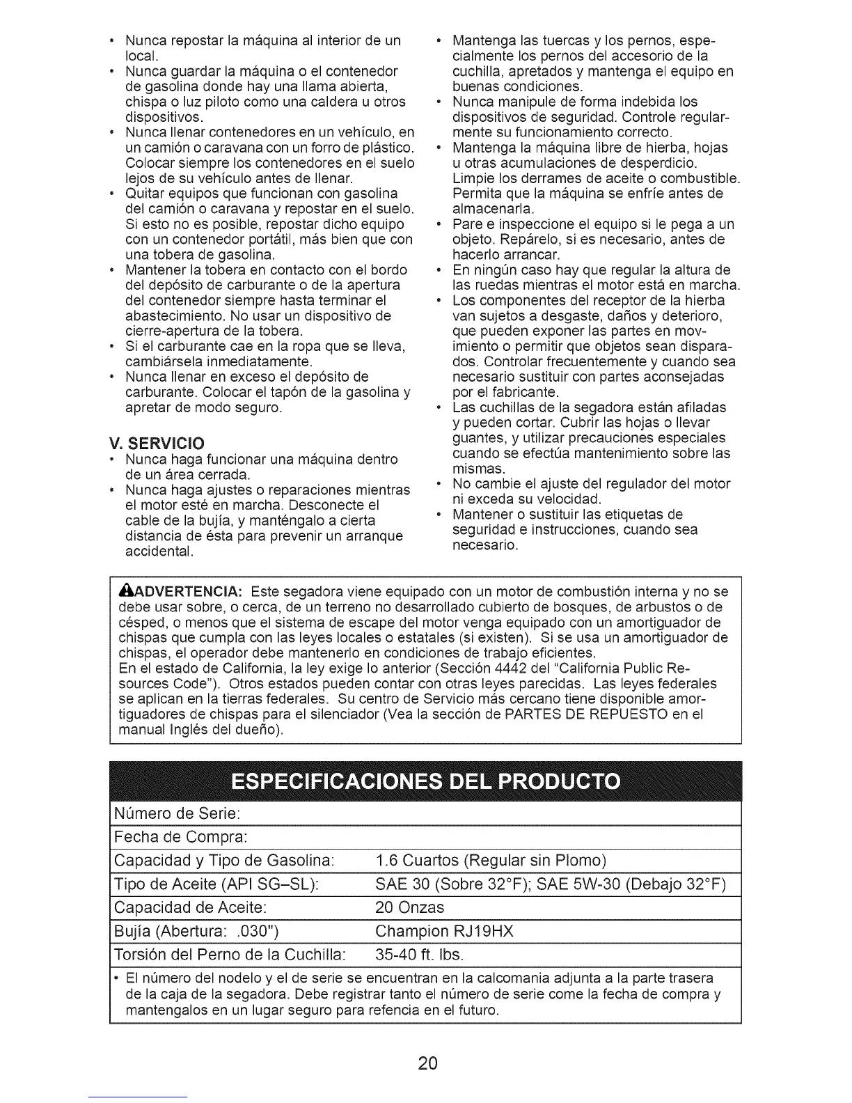 de la caja de la segadora. Debe registrar tanto el nQmero de serie come la fecha de compra y