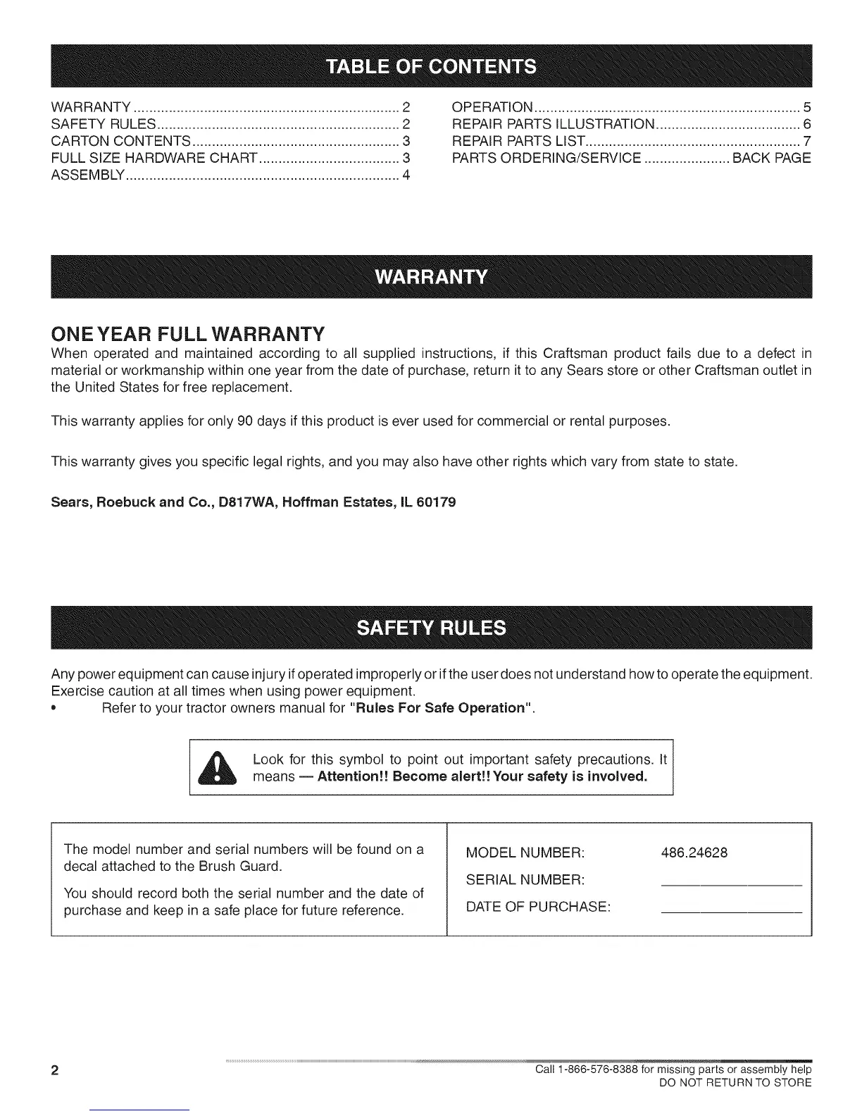 material or workmanship within one year from the date of purchase, return it to any Sears store or other Craftsman outlet in