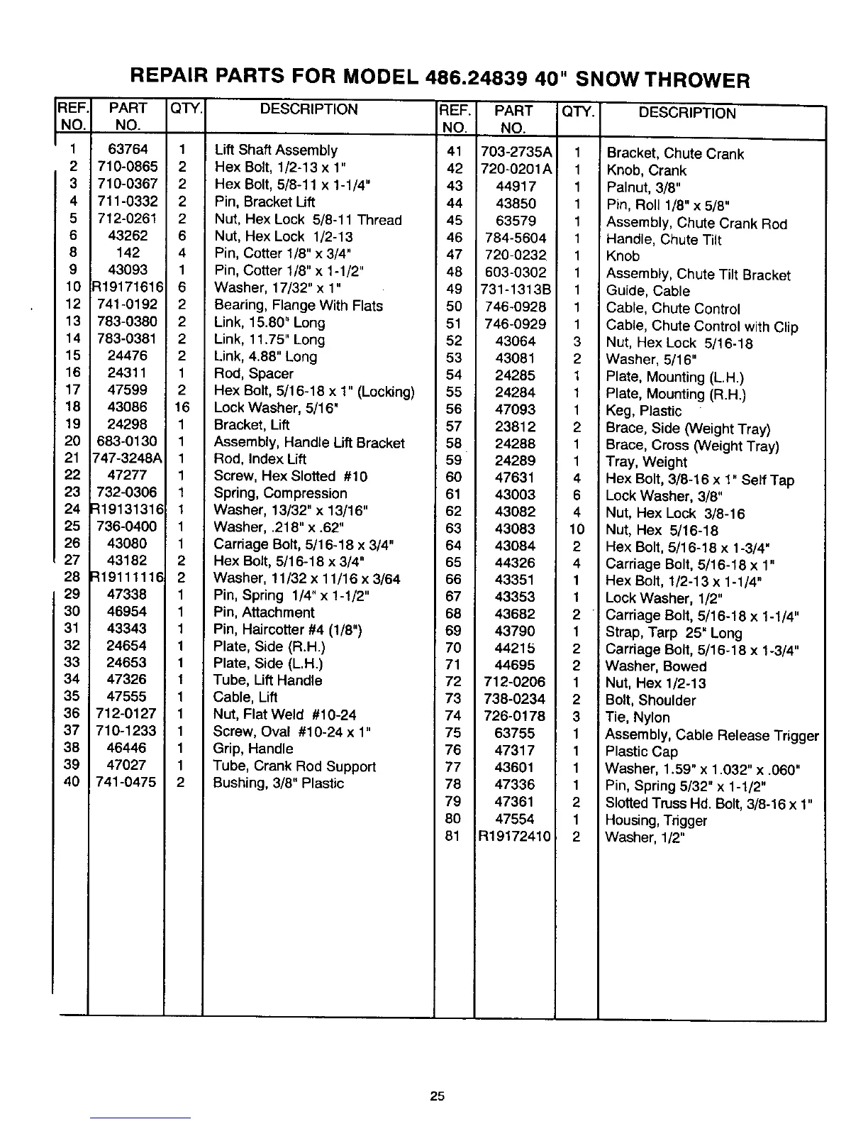 REPAIR PARTS FOR MODEL 486.24839 40" SNOW THROWER