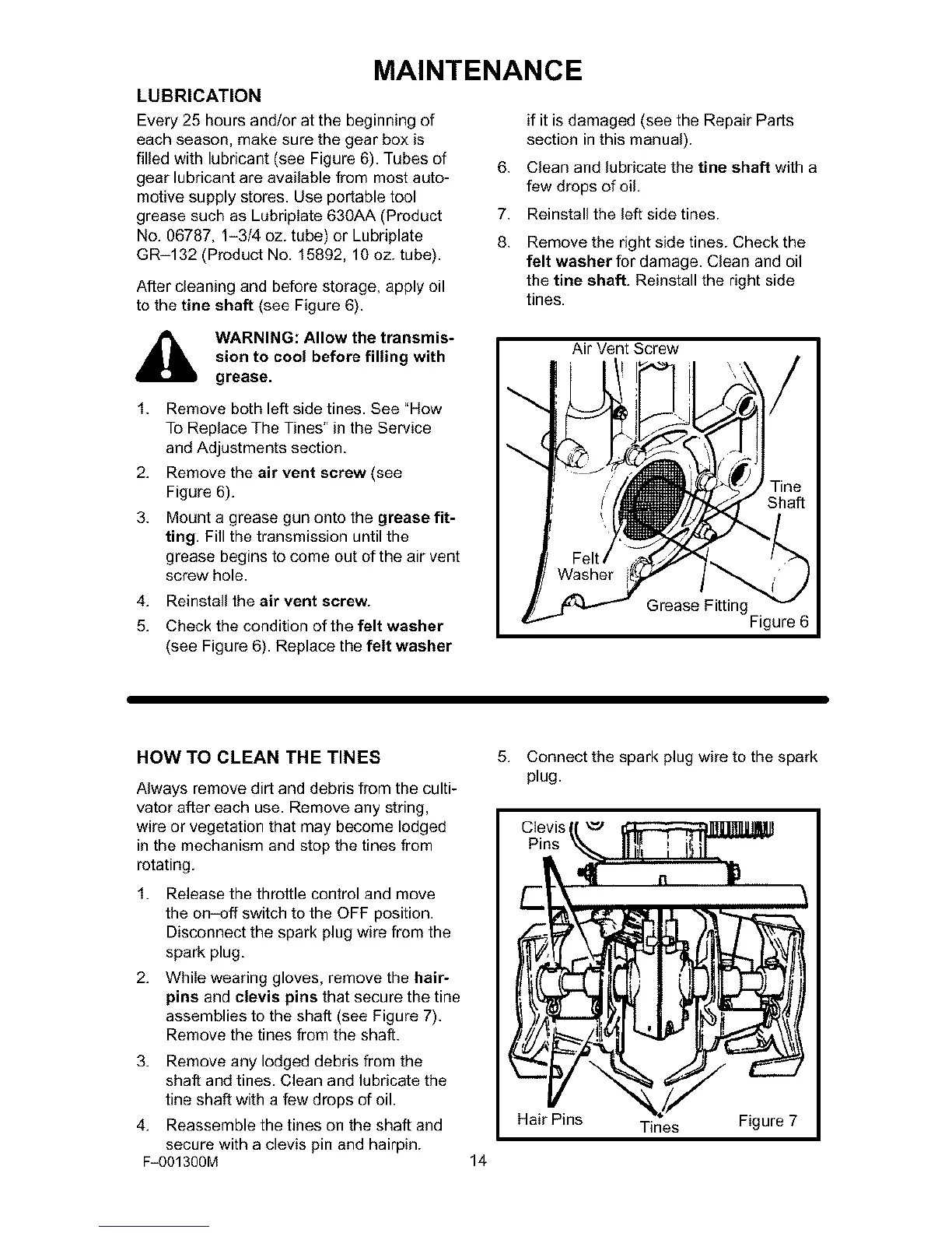 shaft and tines. Clean and lubricate the