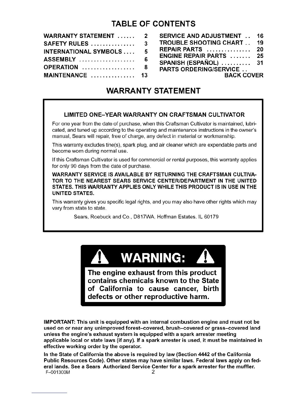 eral lands. See a Sears Authorized Service Center for a spark arrester for the muffler.