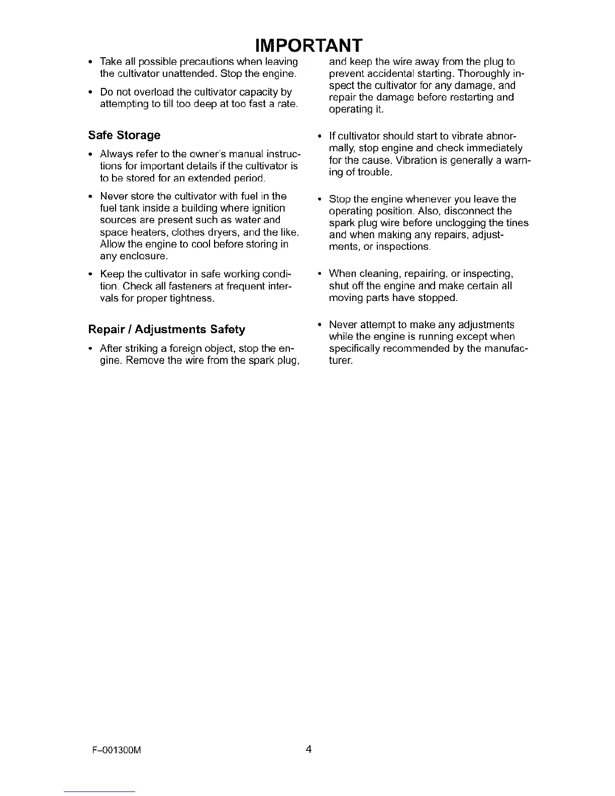 the cultivator unattended. Stop the engine, prevent accidental starting. Thoroughly in-