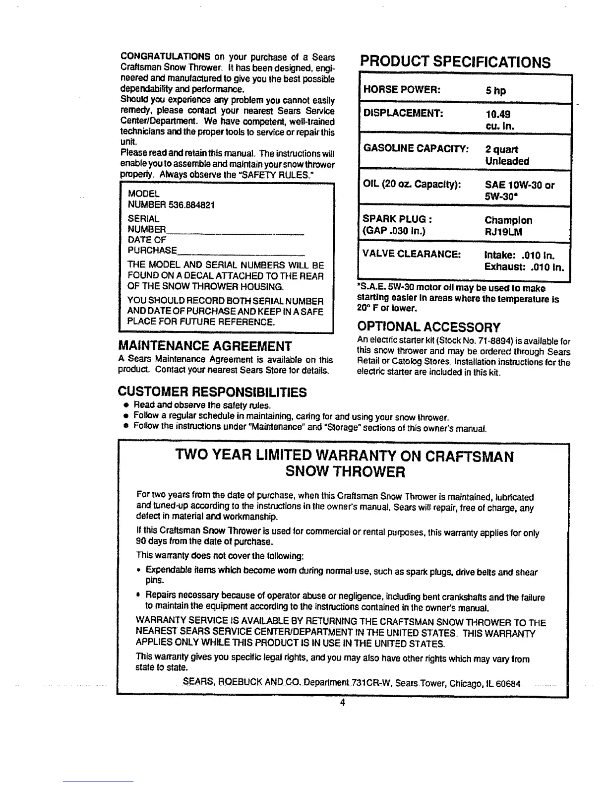 Fortwoyearsfromthe date of purchase,whenthis Craftsman SnowThroweris maintained,lubricated