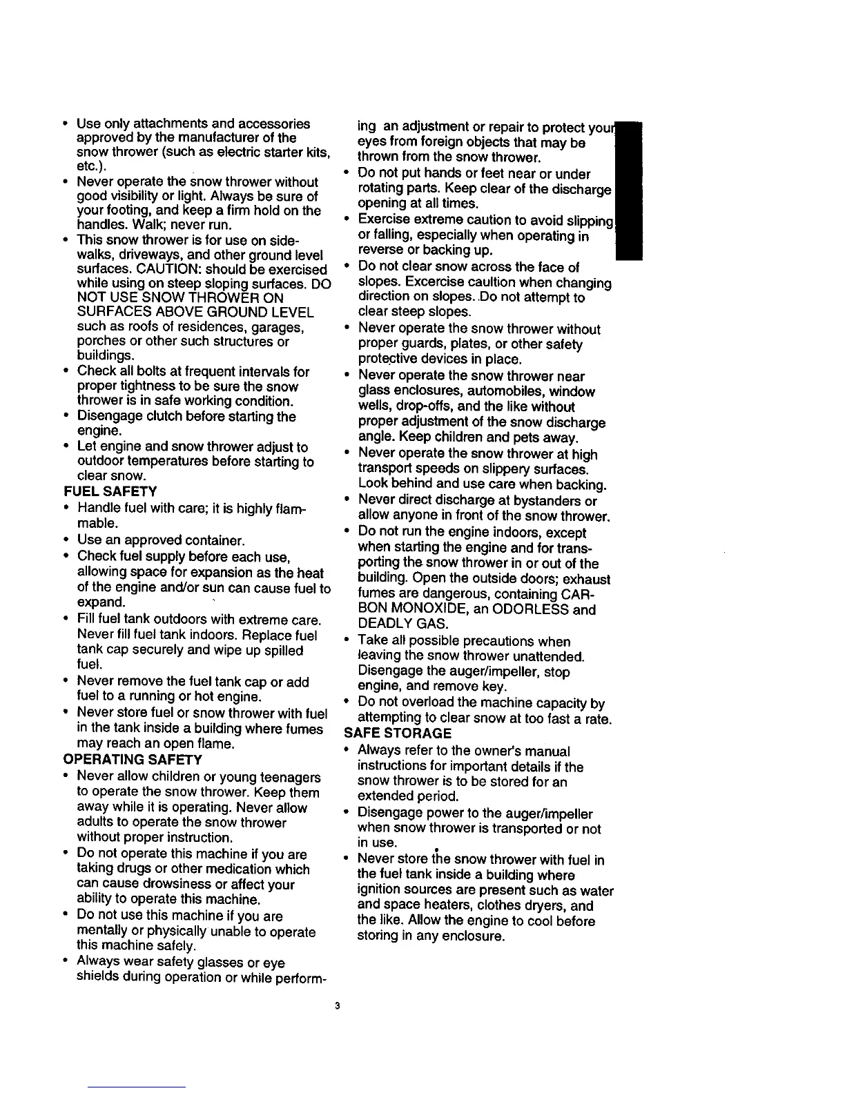 • Never store fuel or snow thrower with fuel