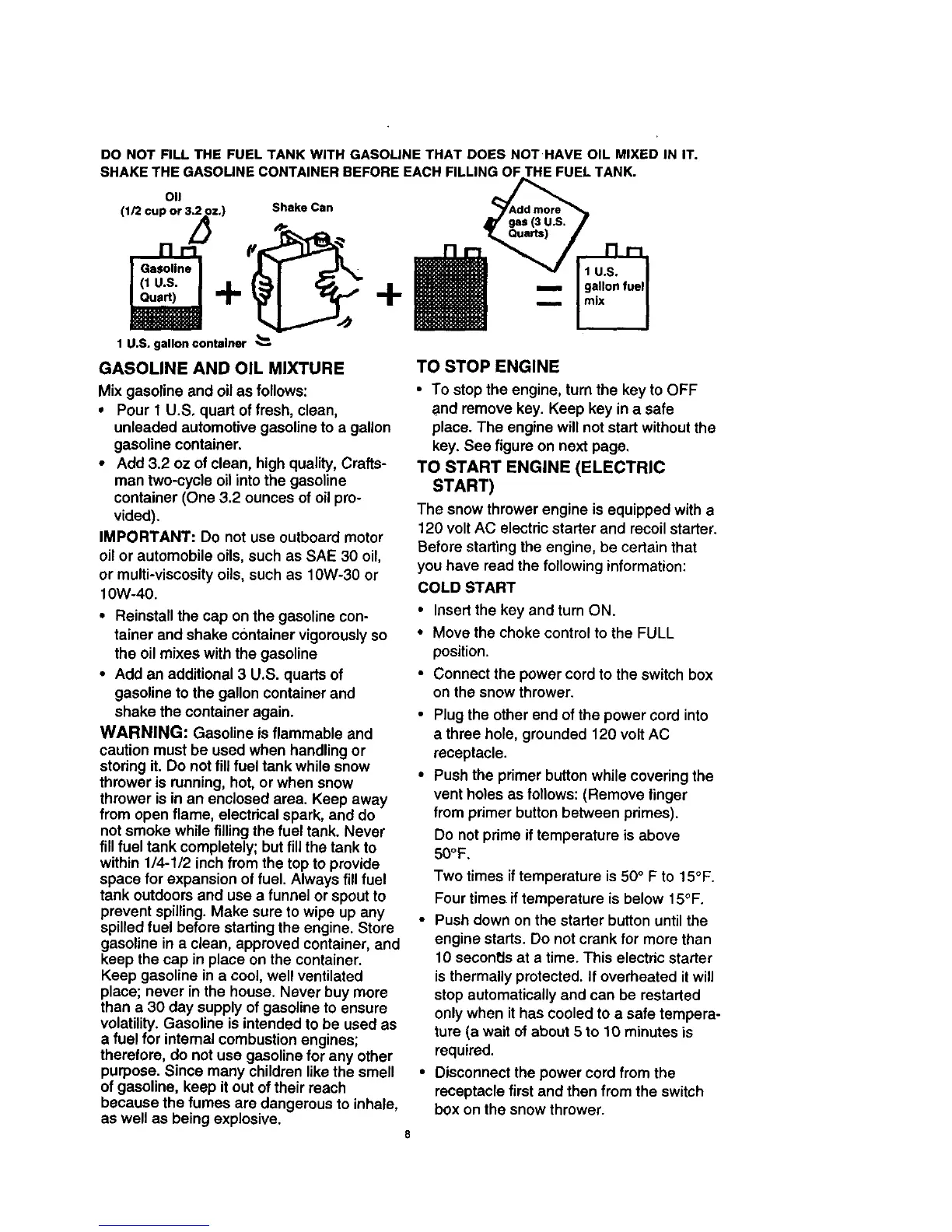 Mix gasoline and oil as follows: