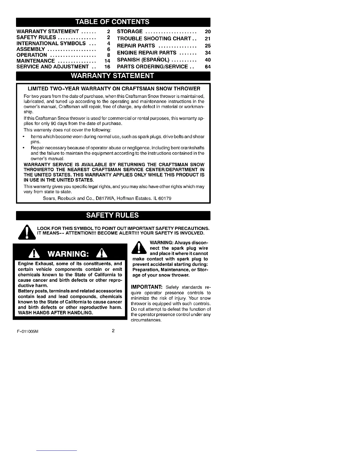 THROWERTO THE NEAREST CRAFTSMAN SERVICE CENTER/DEPARTMENT IN