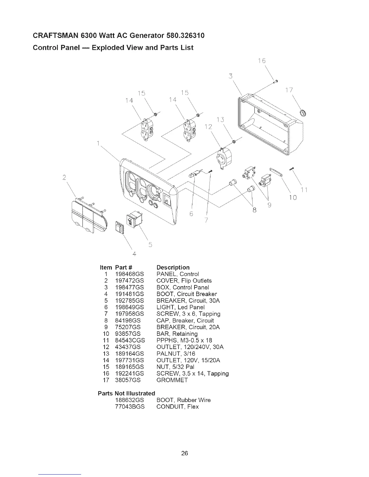 Craftsman 580.326310 - Control Panel - Exploded View and Parts List
