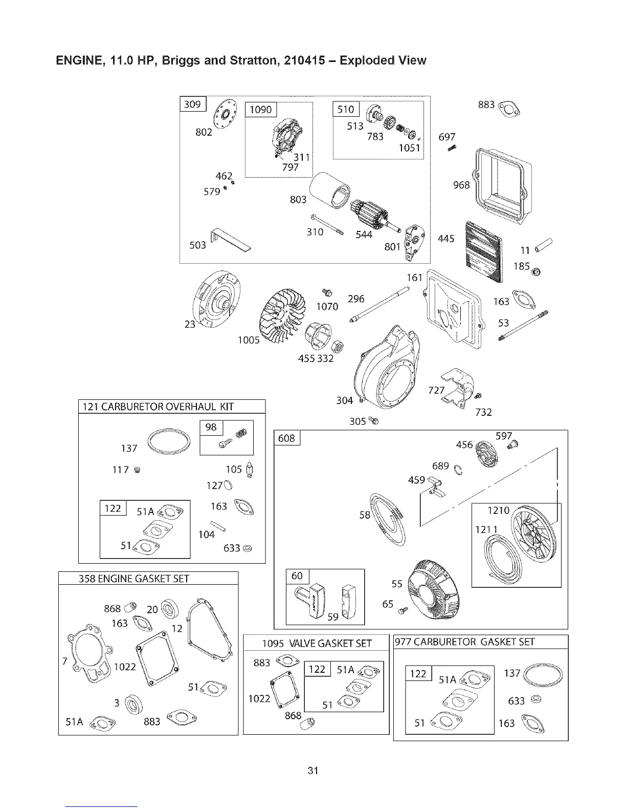 ENGINE, 11.0 HP, Briggs and Stratton, 210415 - Exploded View